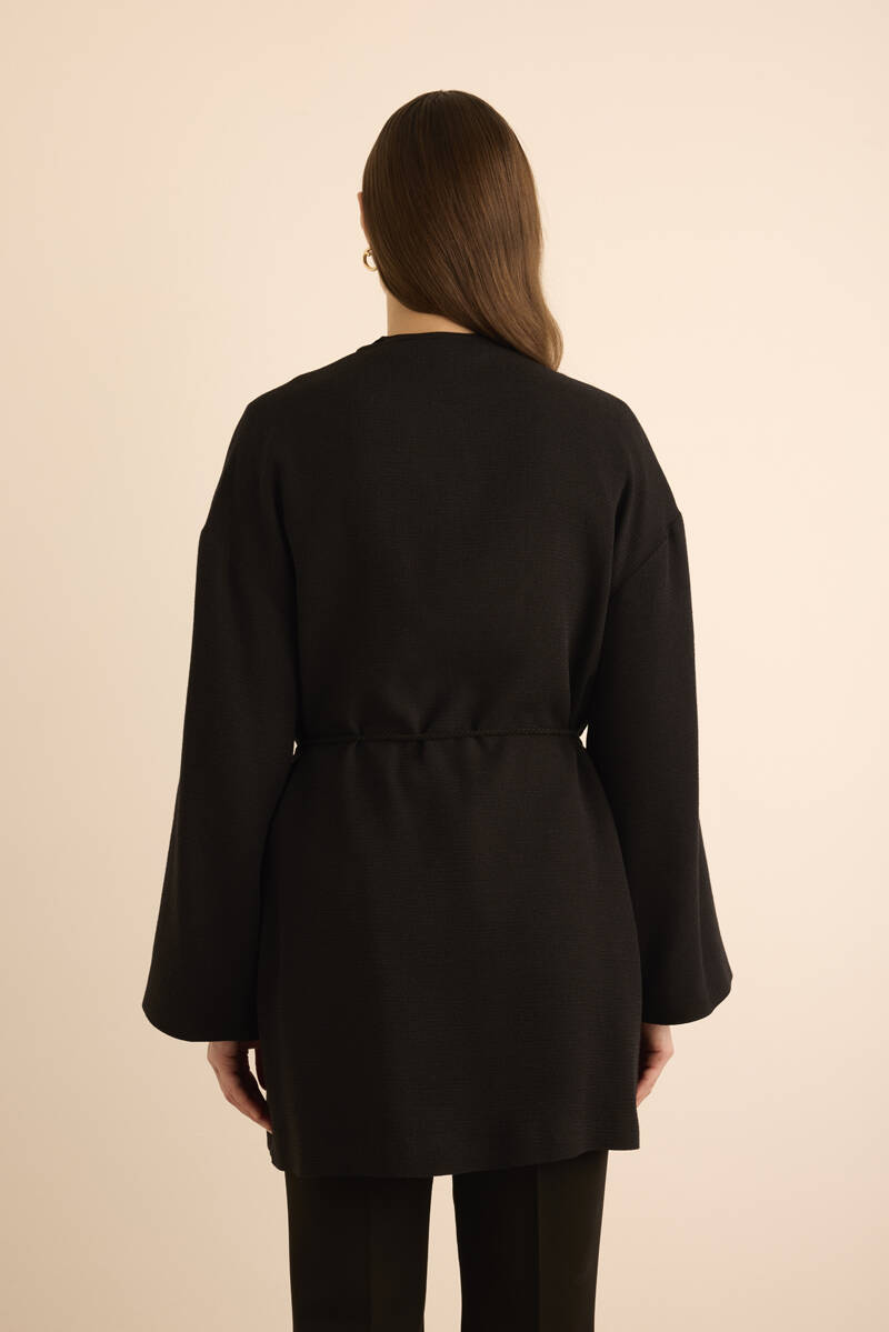 Siyah Önden Düğmeli Yakası Geri Dönüşlü Örme Hırka
