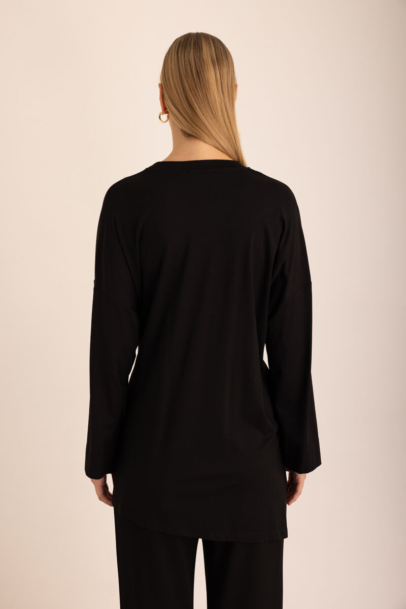 Lacivert Yandan Pili ve İşleme Detaylı Dokuma Bluz