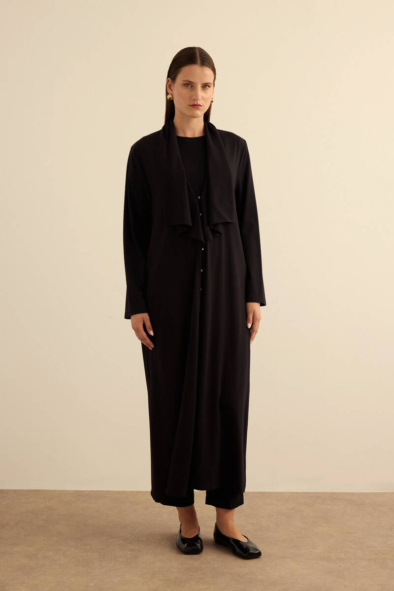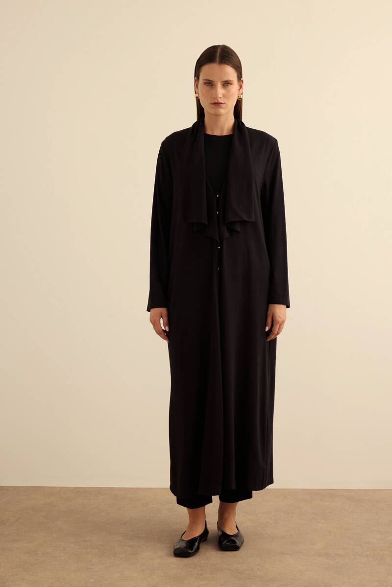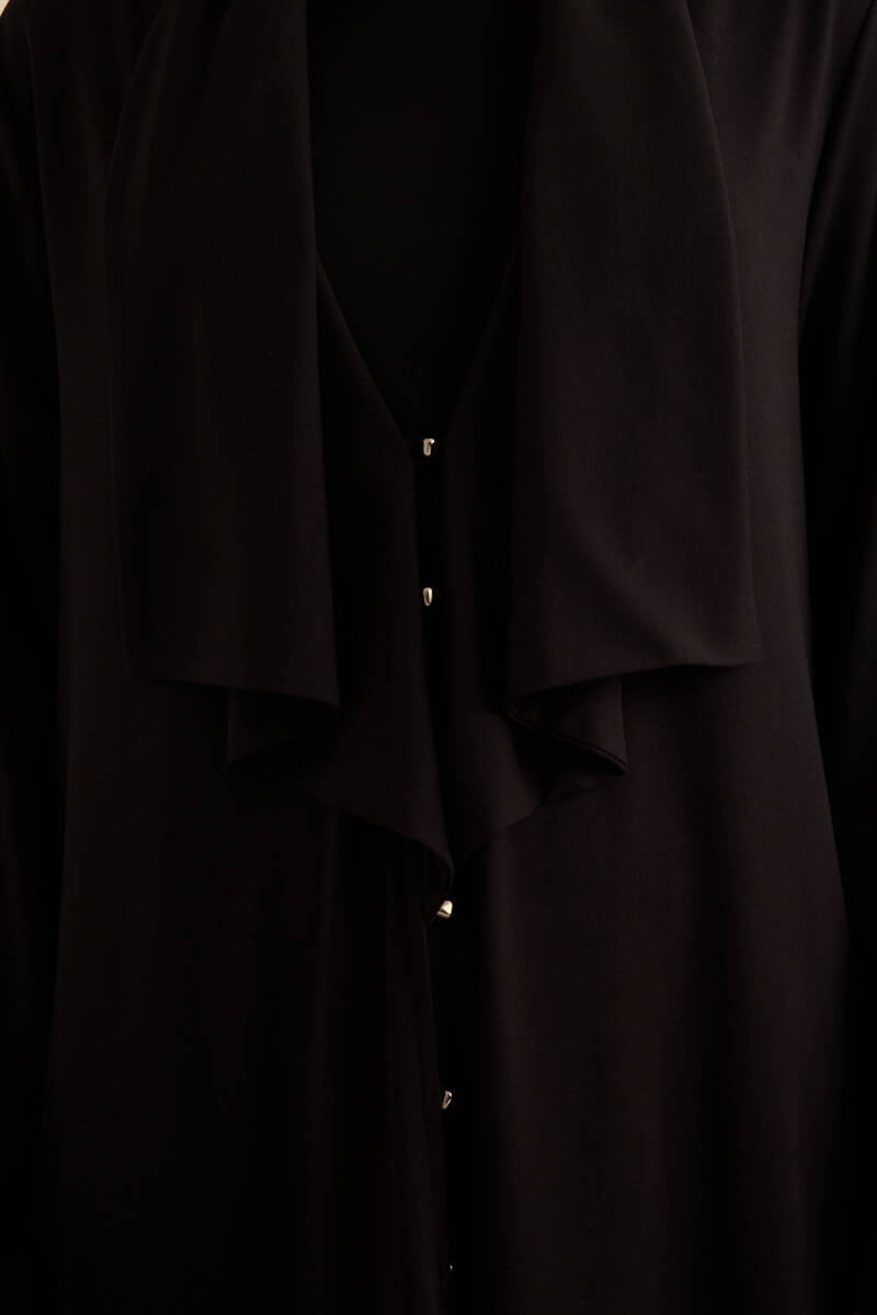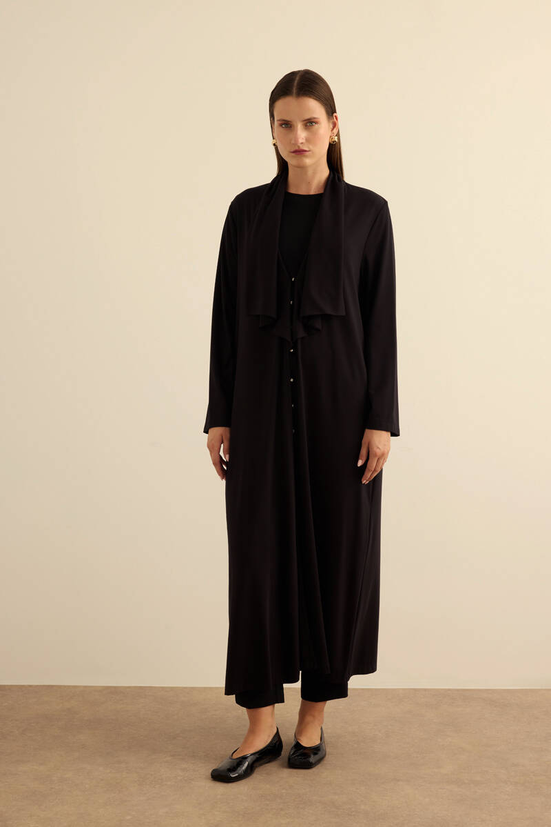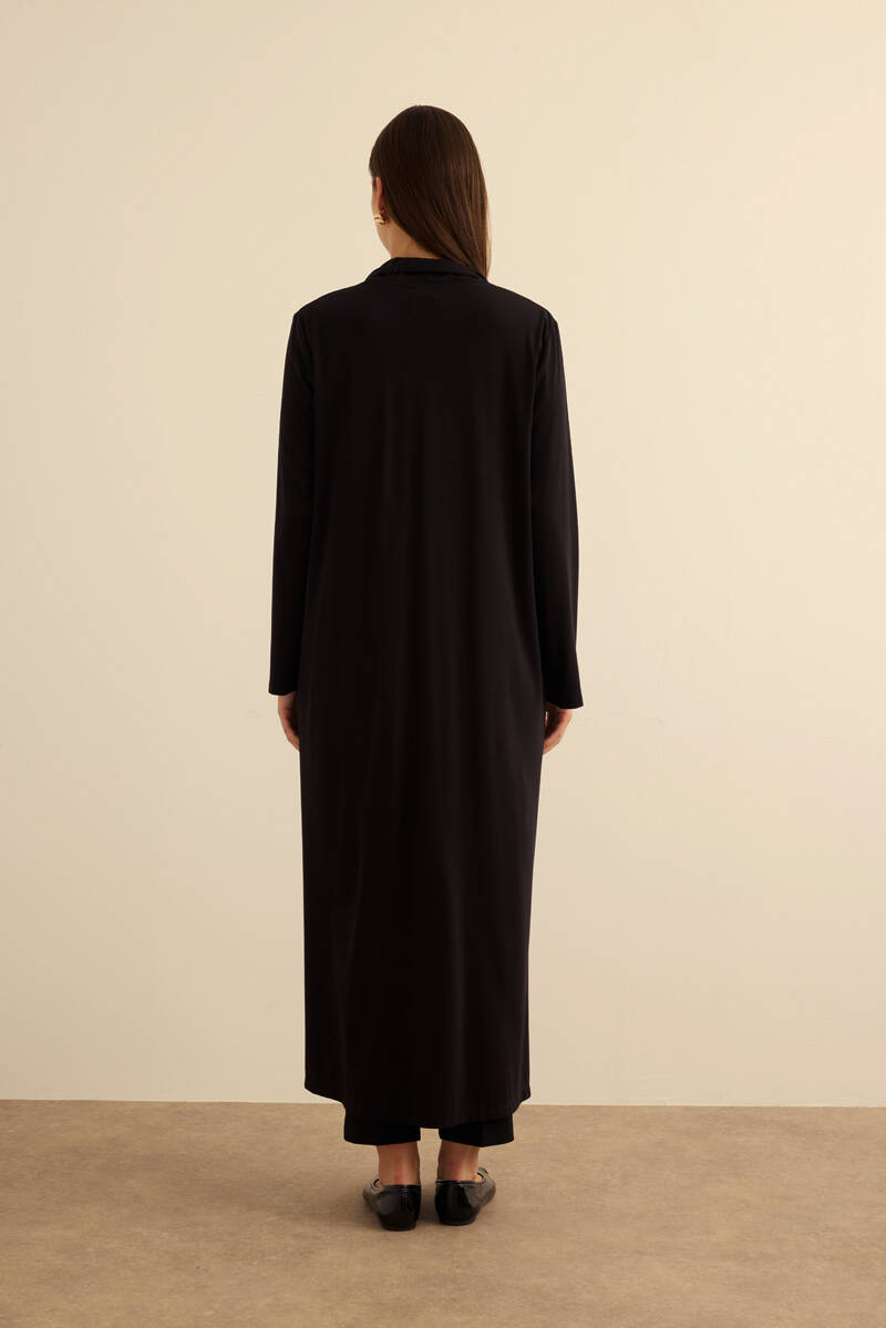Siyah Önden Düğmeli Yakası Geri Dönüşlü Örme Hırka