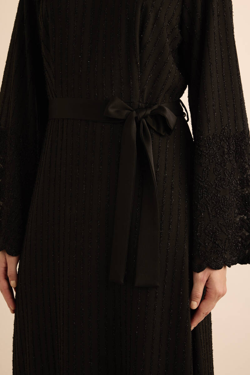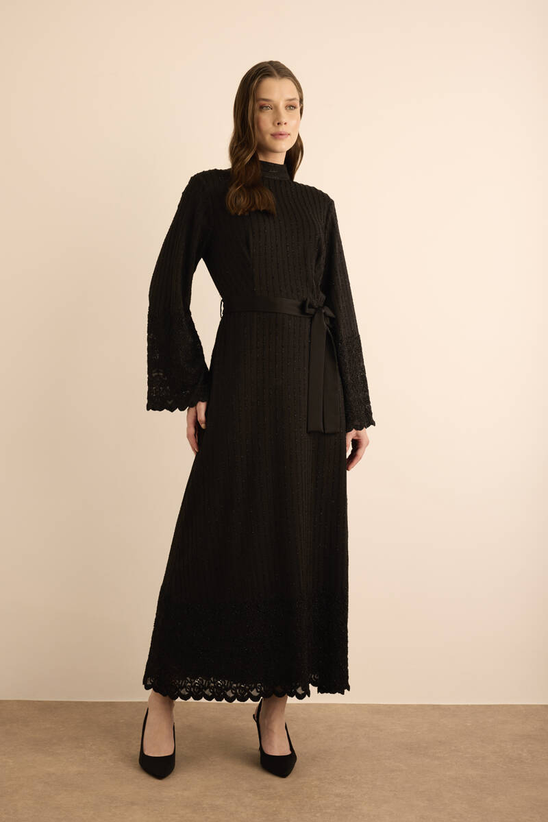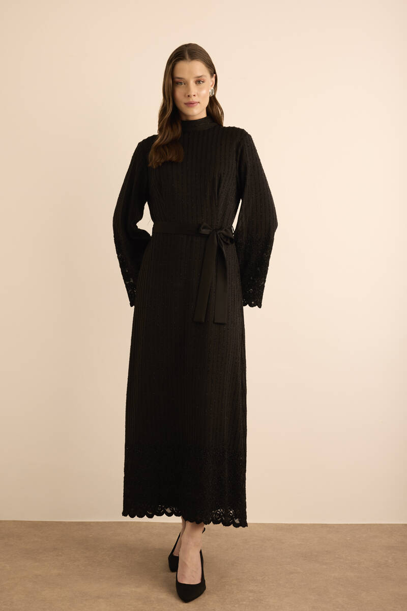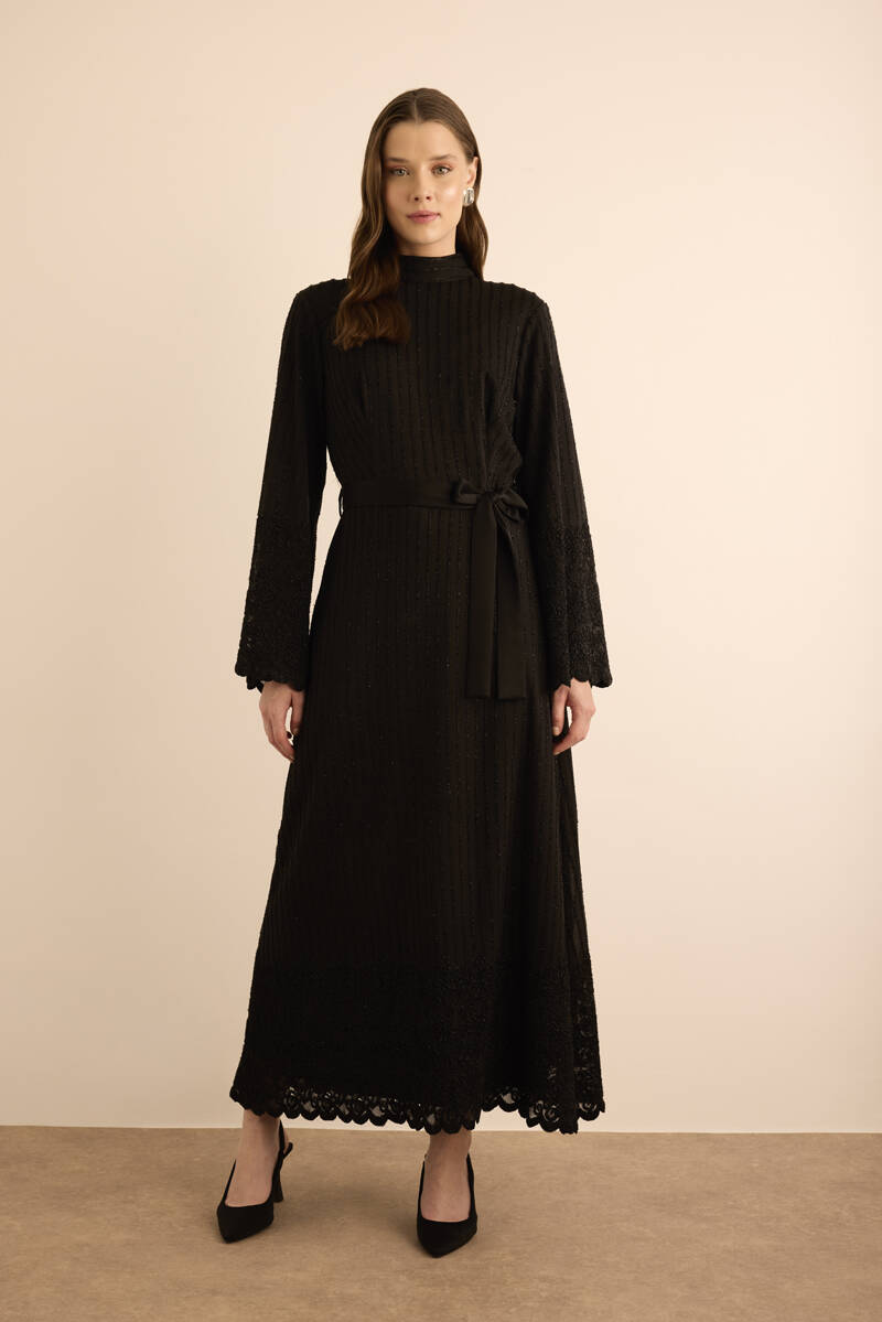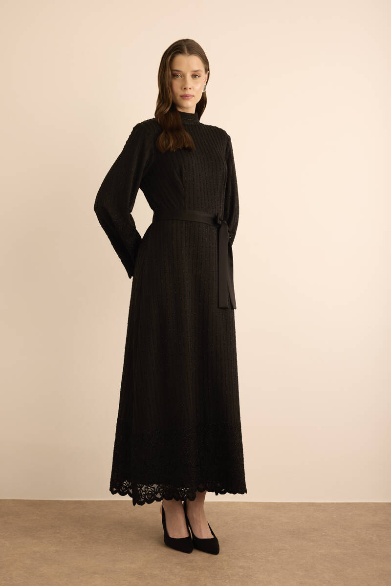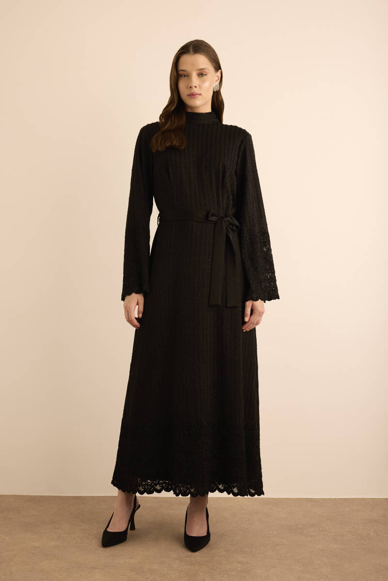 Siyah Etek Ucu Kontrast Nakış Detaylı Elbise