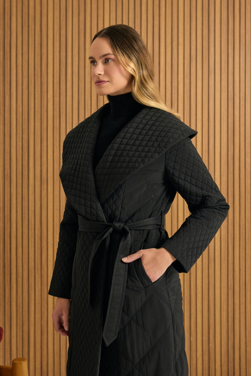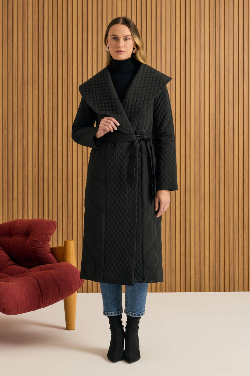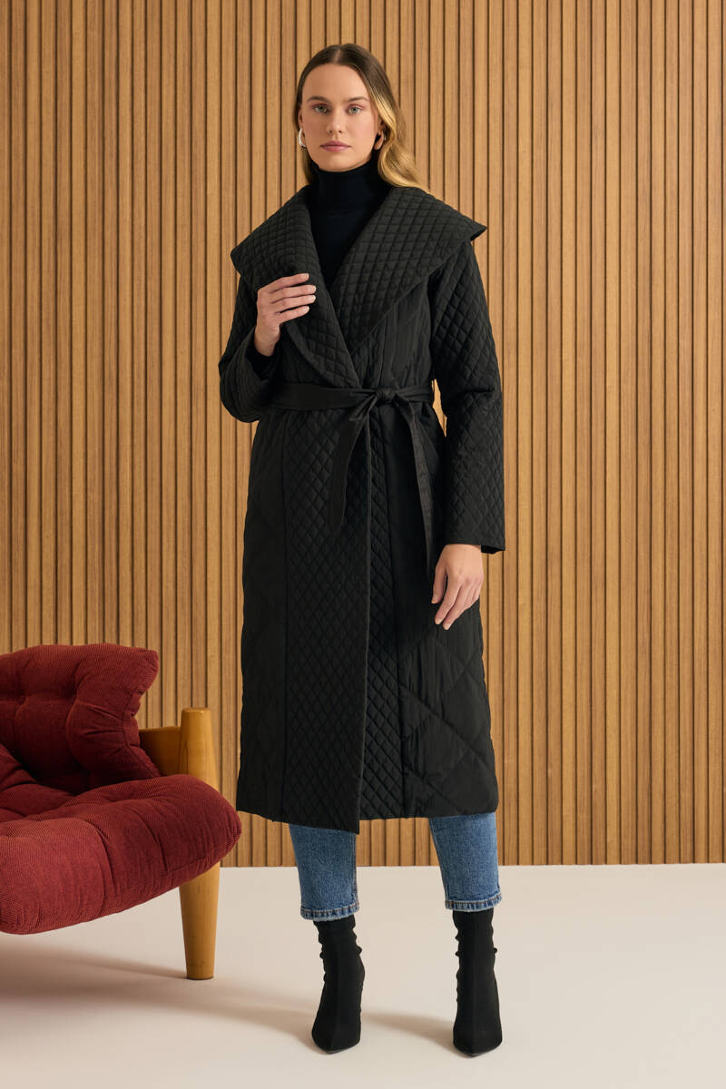 Siyah Fermuarlı Seyyar Kuşaklı Kapitone Mont