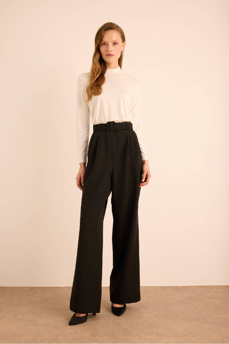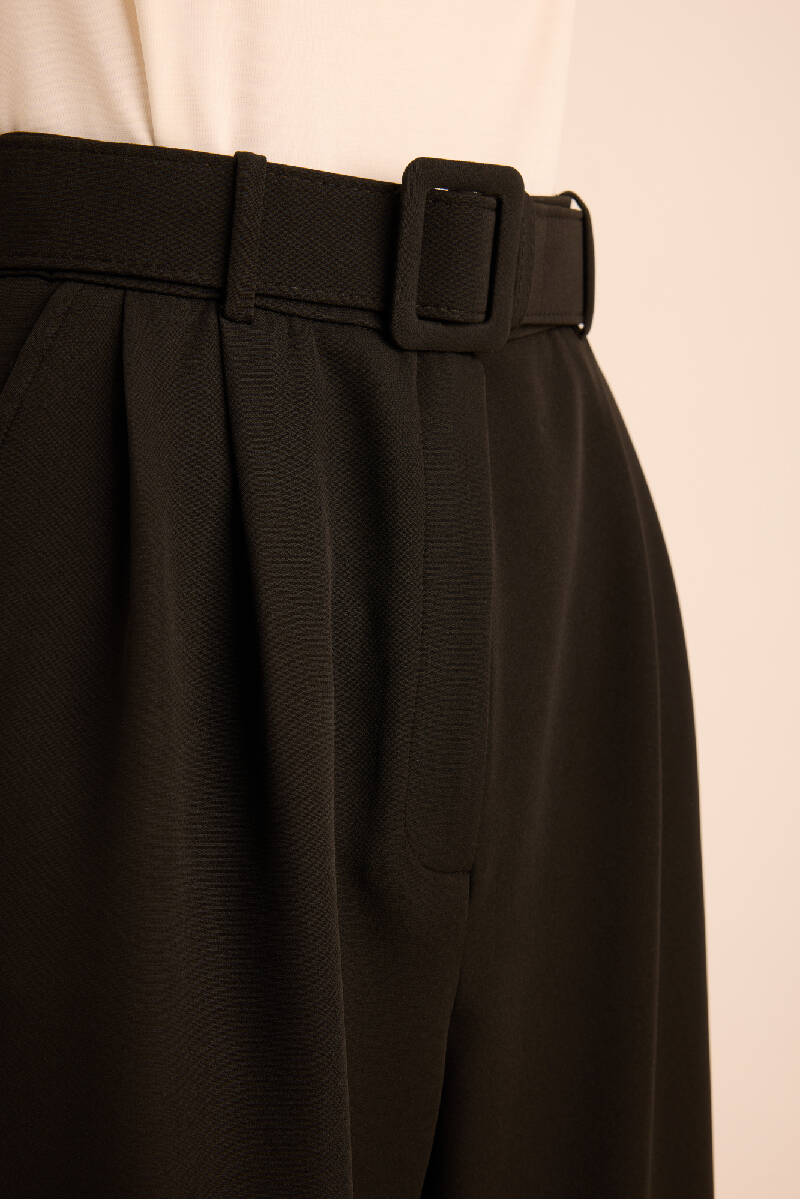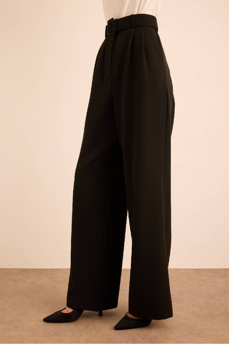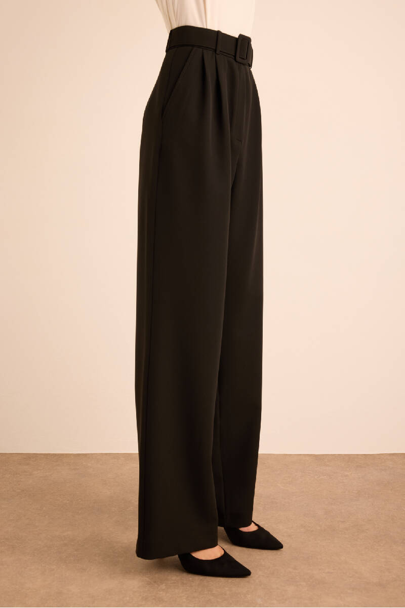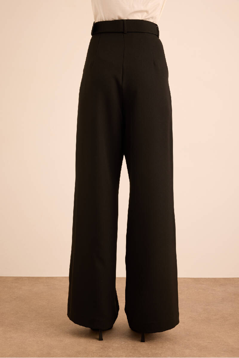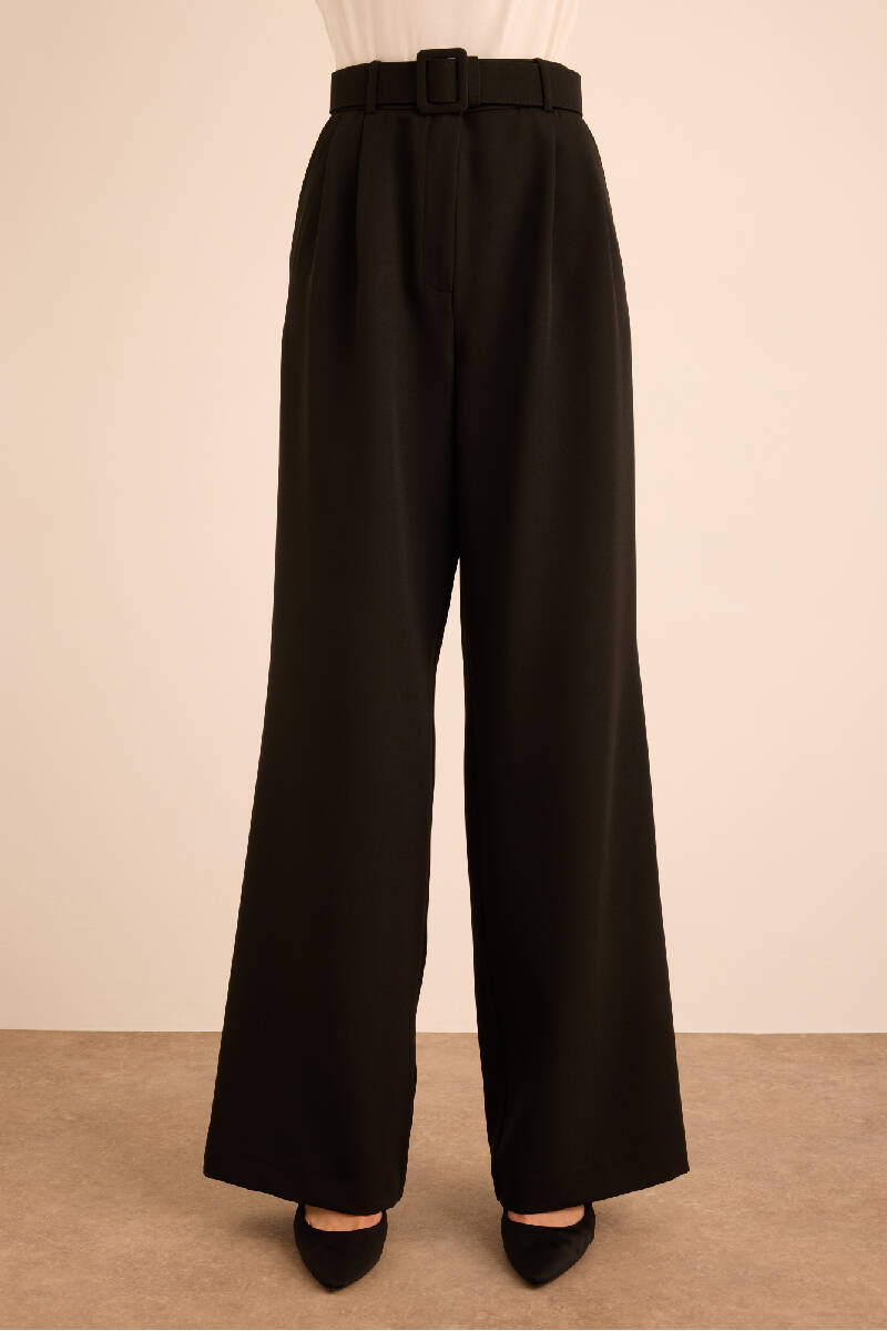 Siyah Seyyar Kumaş Kemerli Dokuma Pantolon