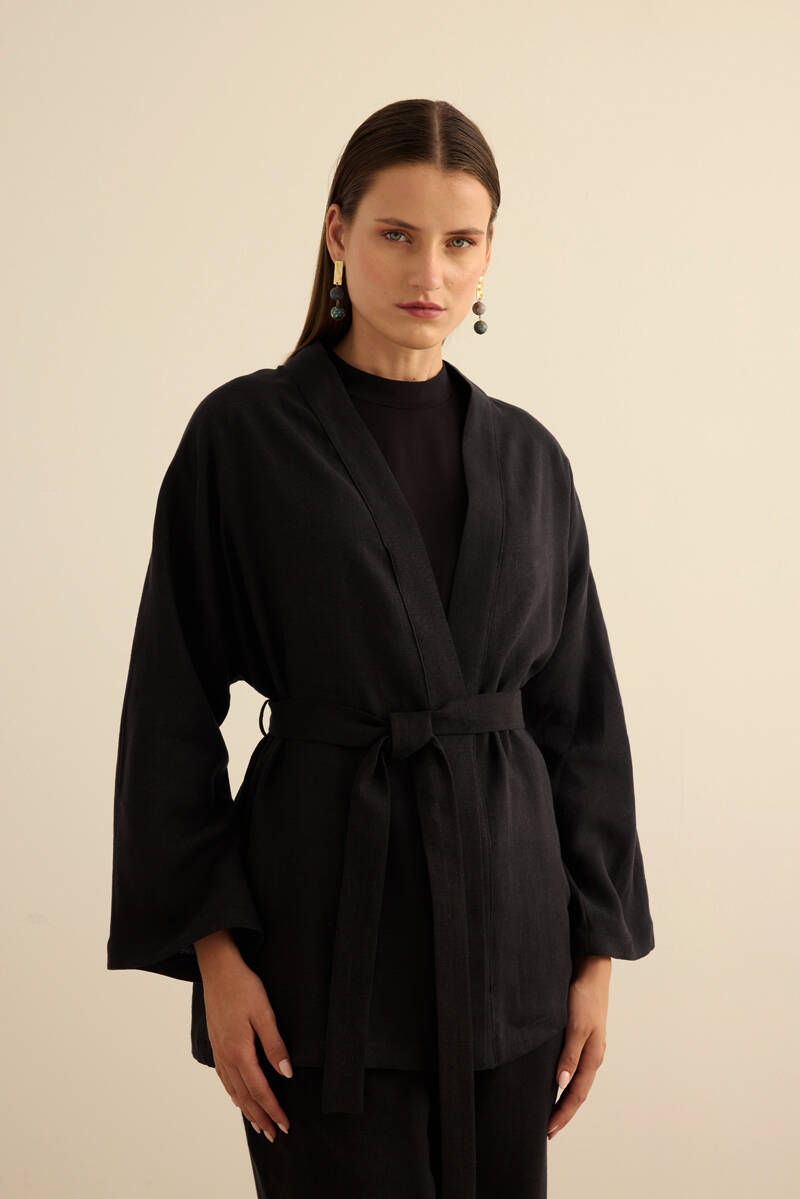 Yeşil Seyyar Kuşaklı Keten Kımono