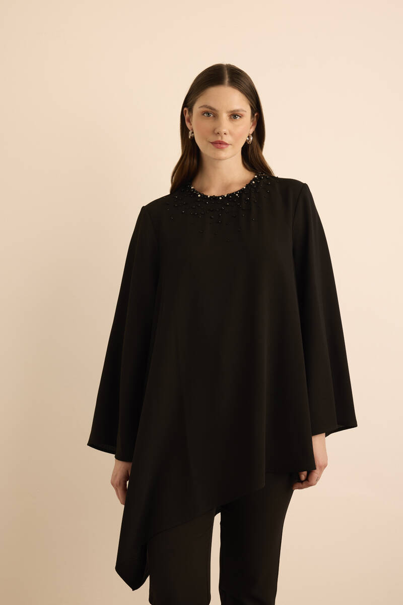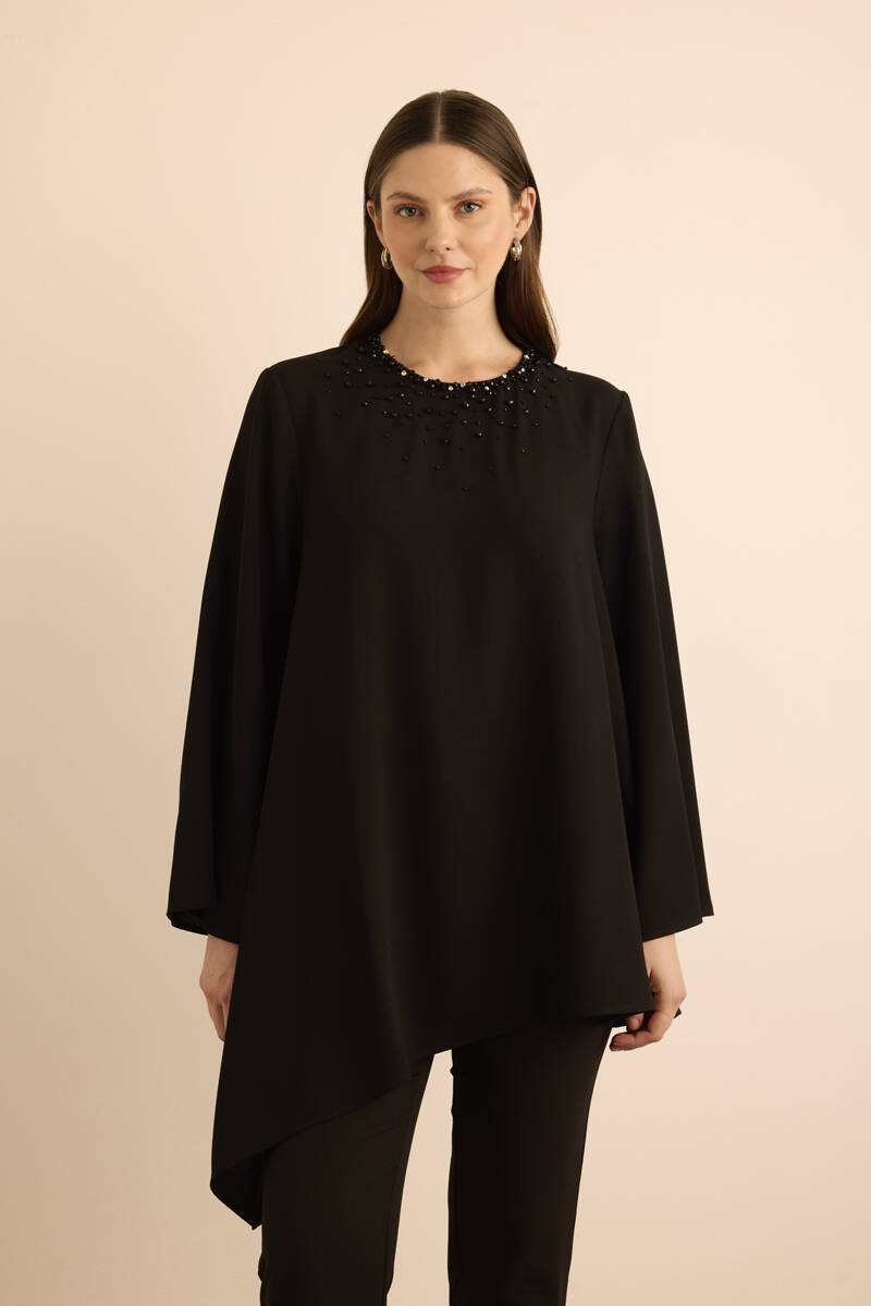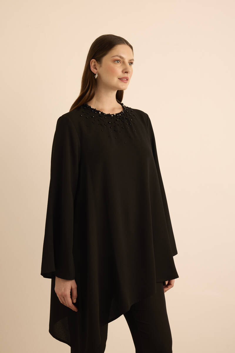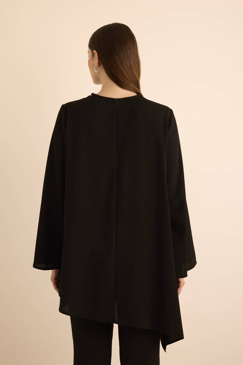 Siyah Yakası Fermuarlı Keten Tencel Tunik