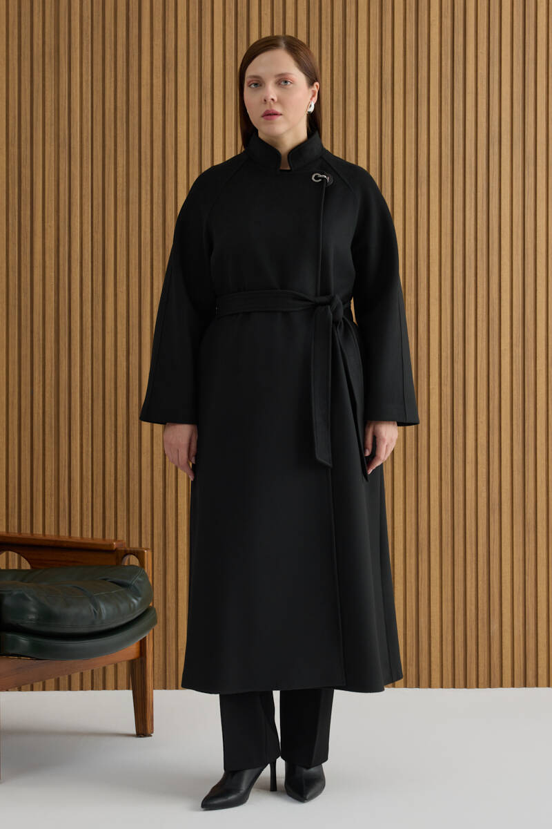 Siyah Yakası Deri ve Metal Kapama Aksesuarlı Manto