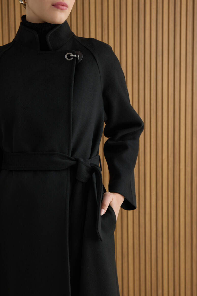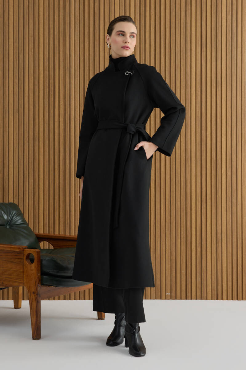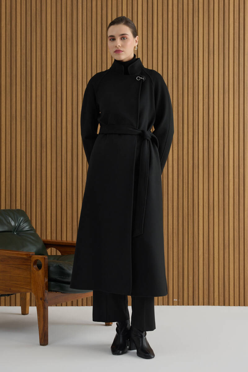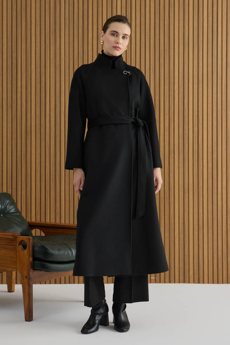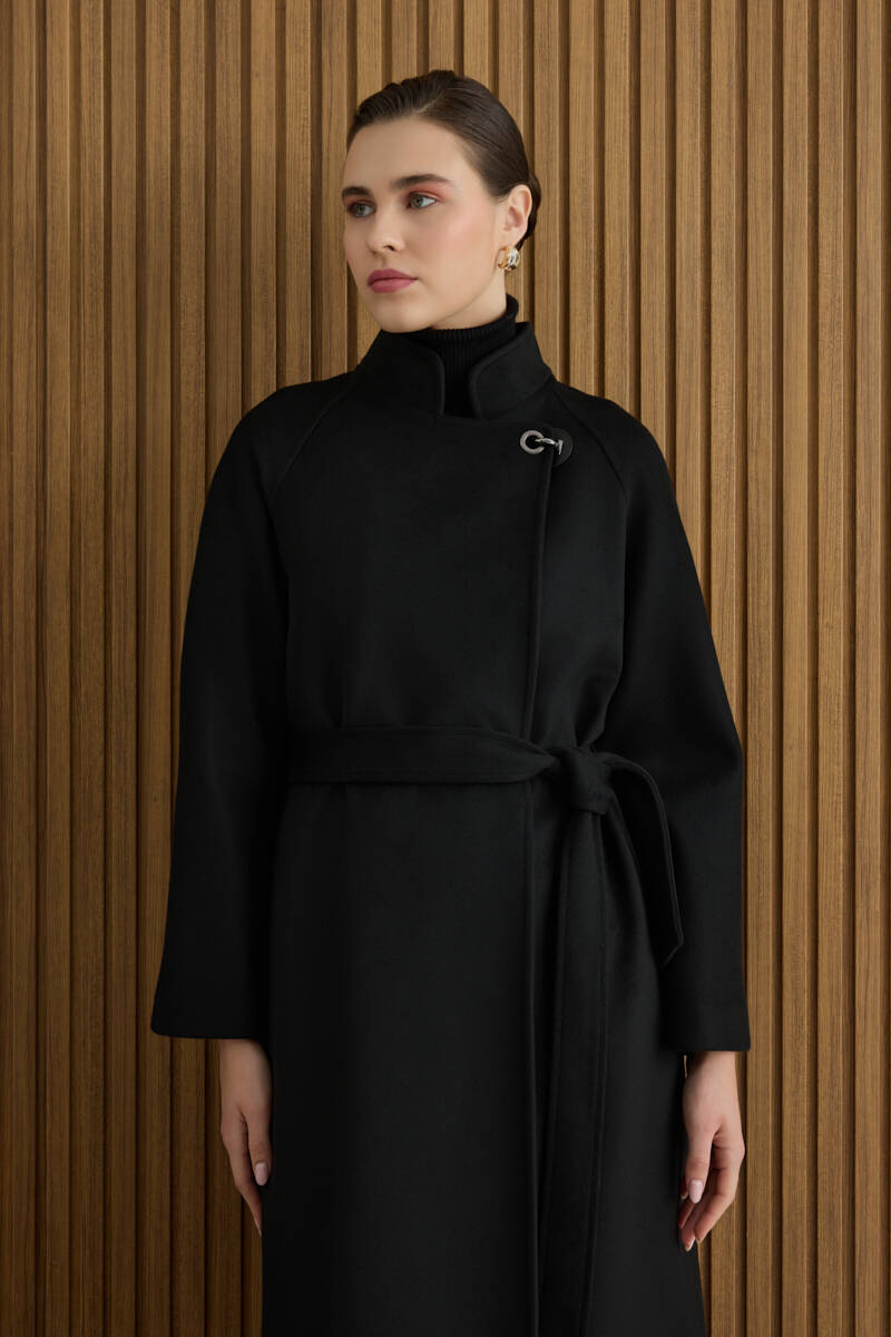 Siyah Yakası Deri ve Metal Kapama Aksesuarlı Manto