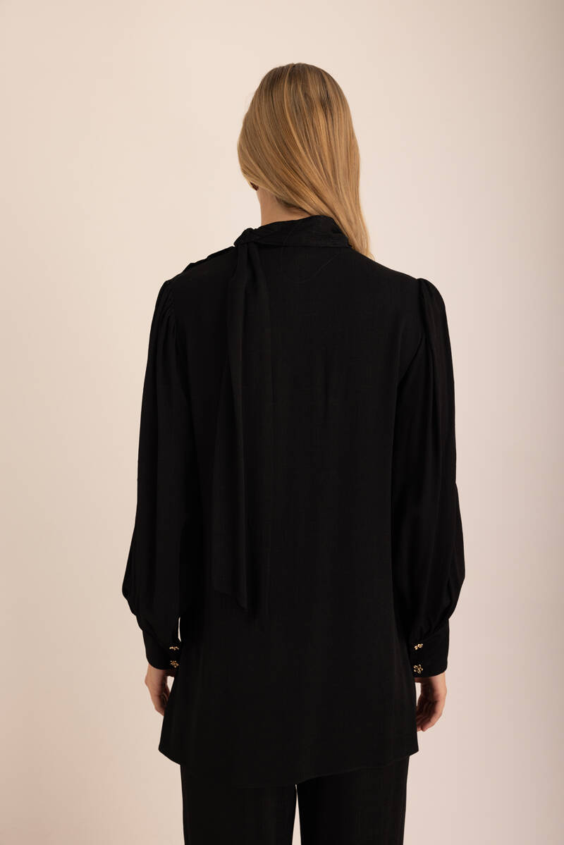 Lacivert Yandan Pili ve İşleme Detaylı Dokuma Bluz