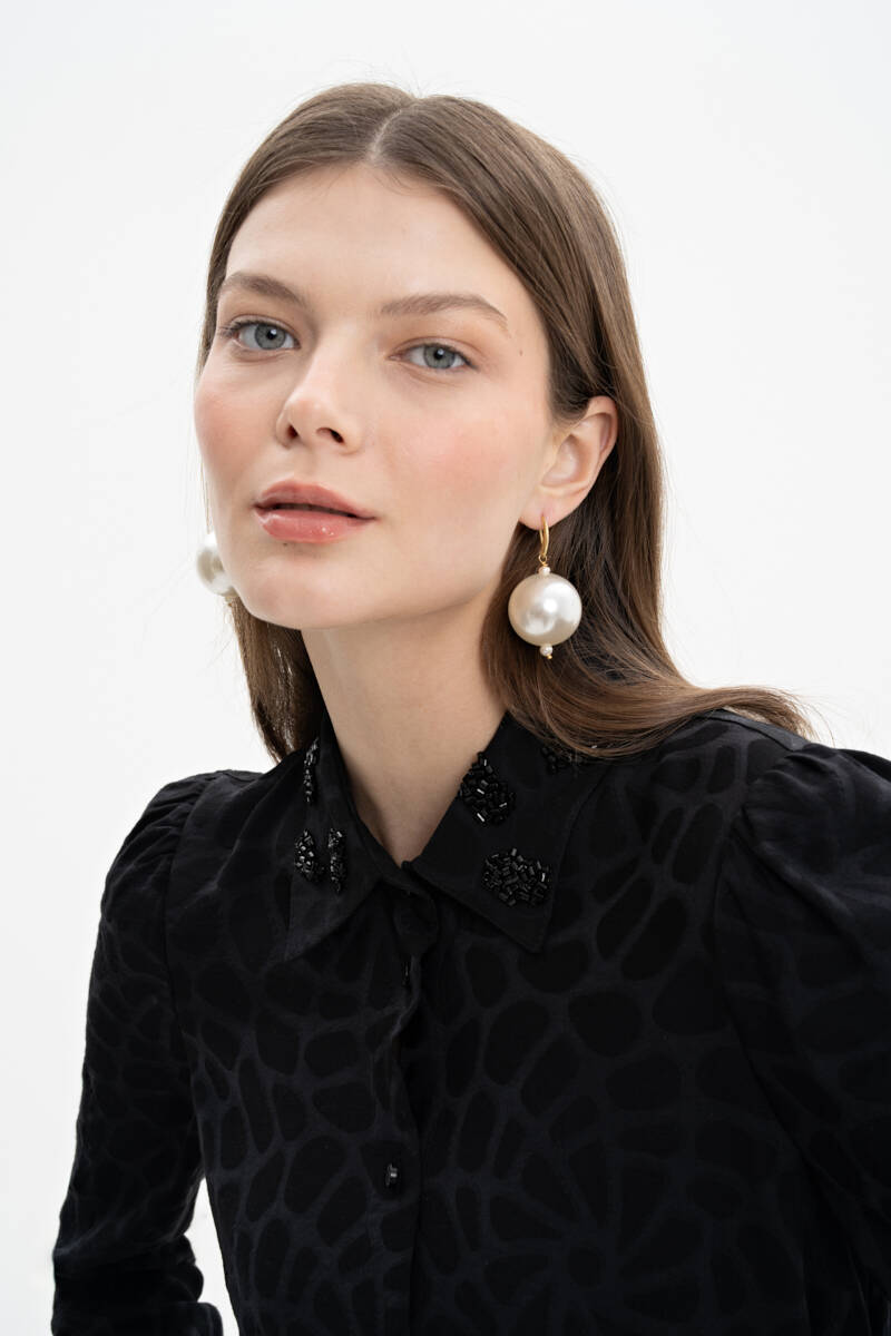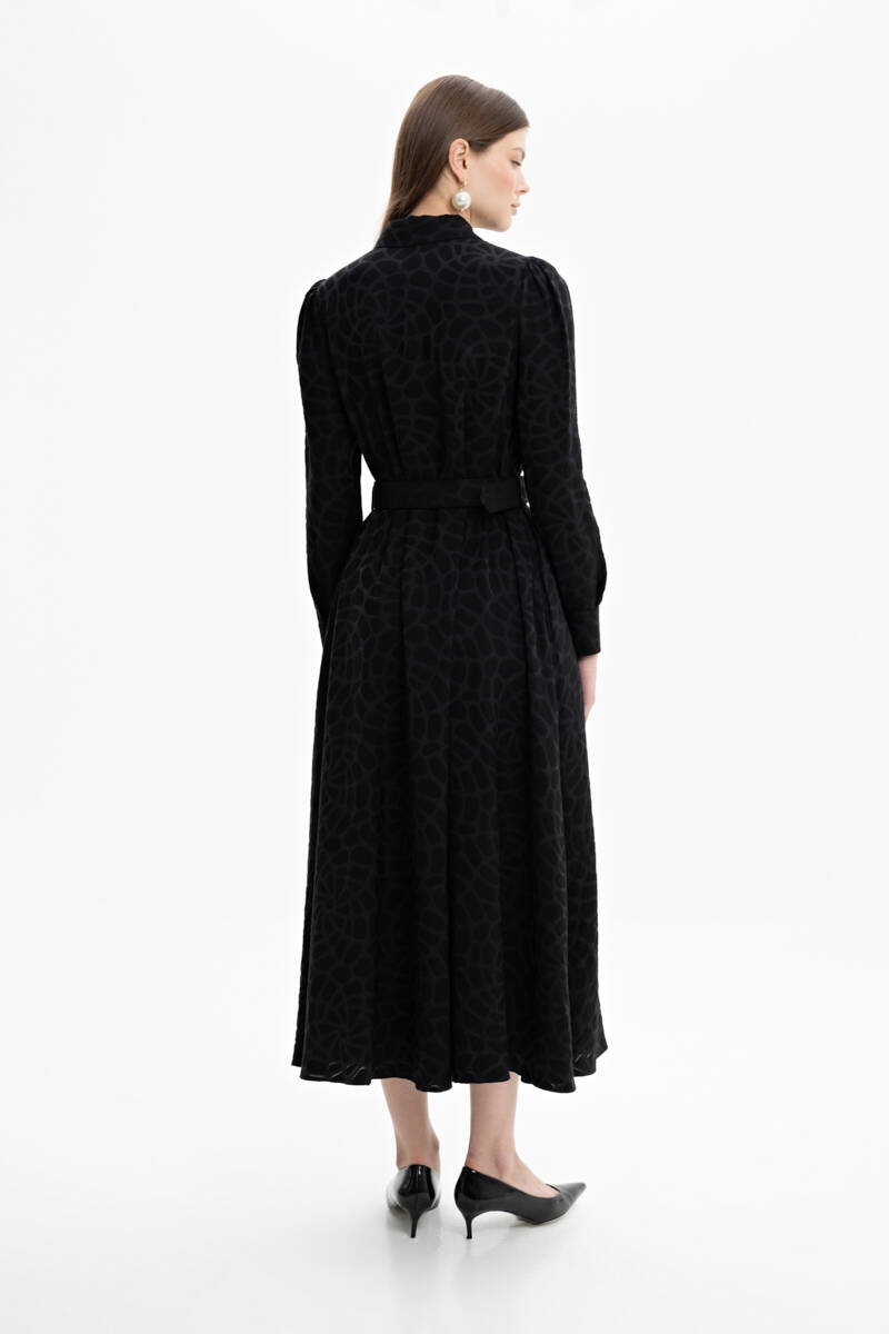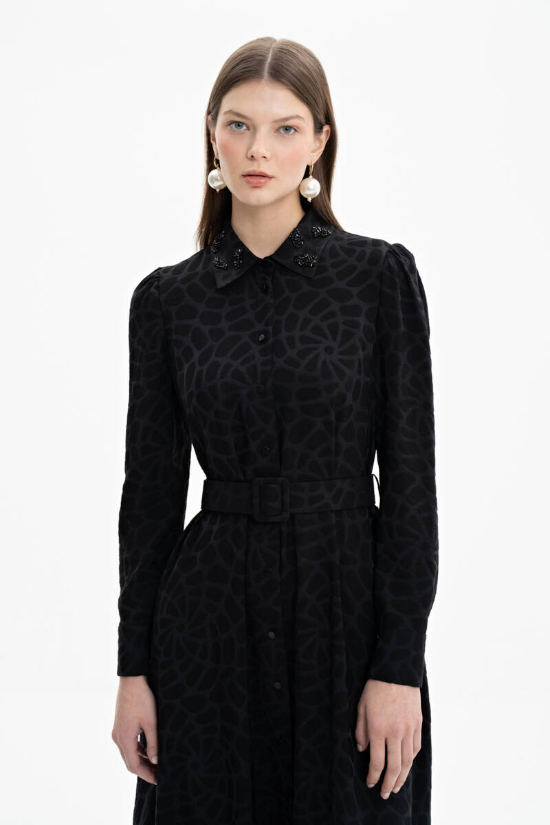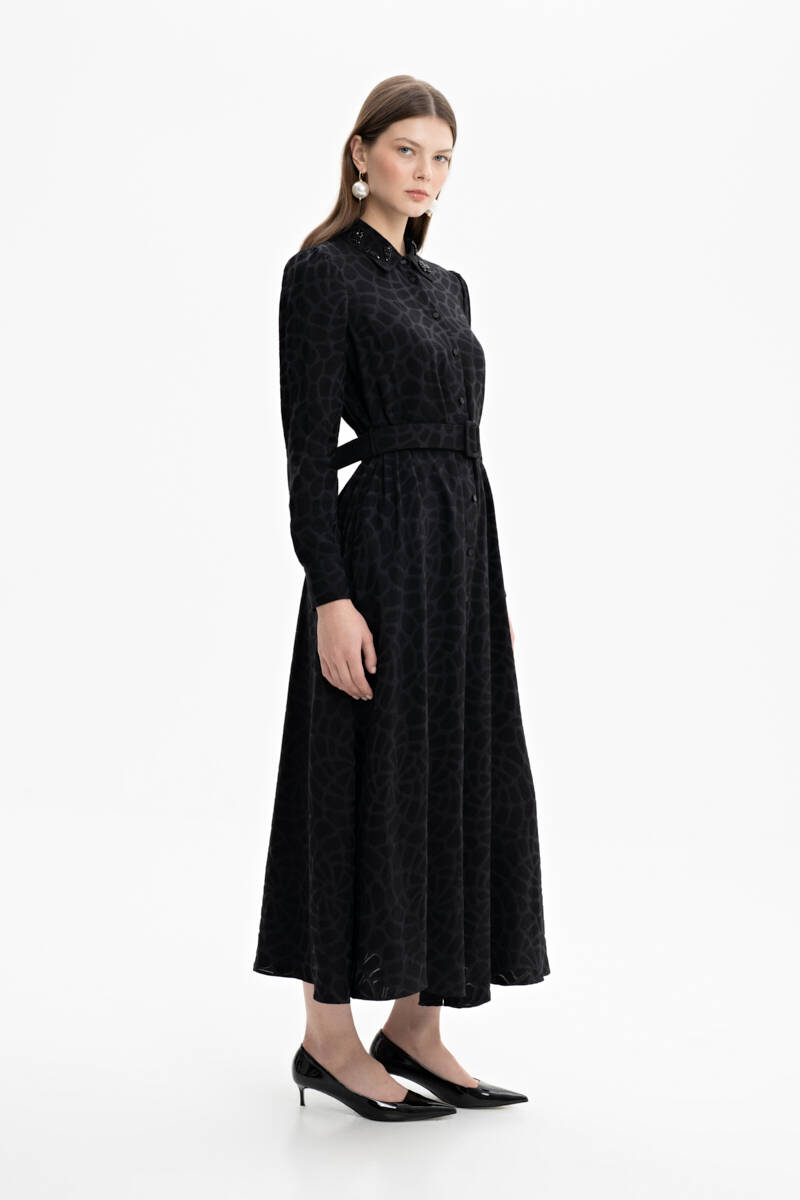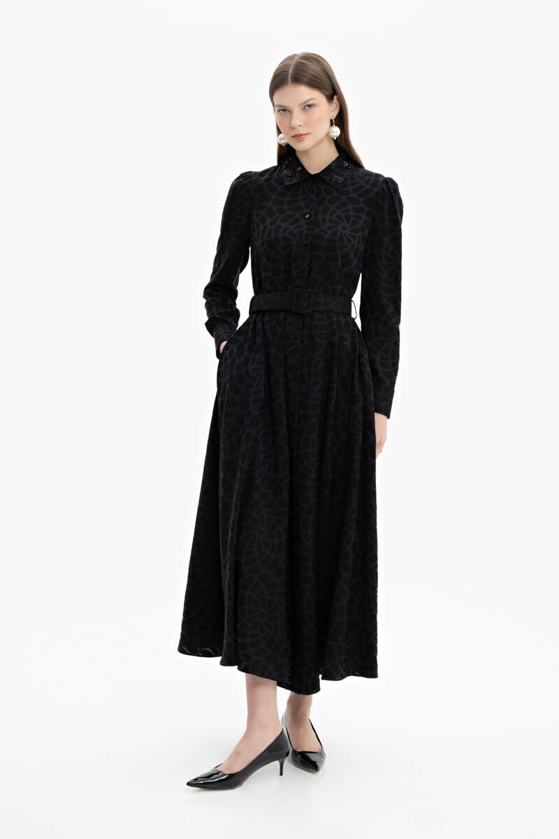 Siyah Yakası İşlemeli Kemer Detaylı Elbise