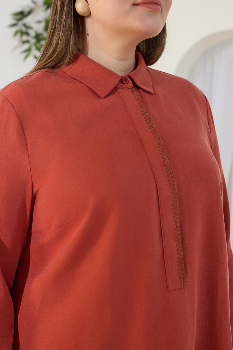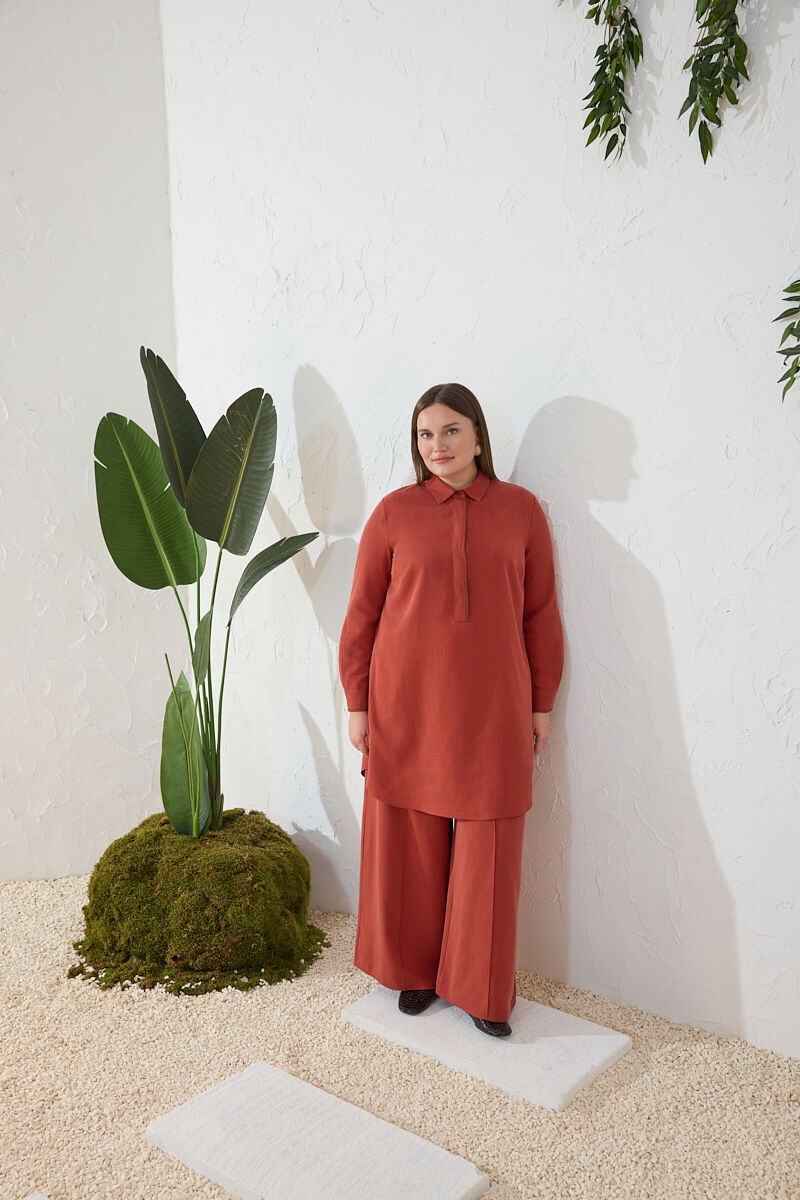 Kahverengi Yakası Fermuarlı Keten Tencel Tunik