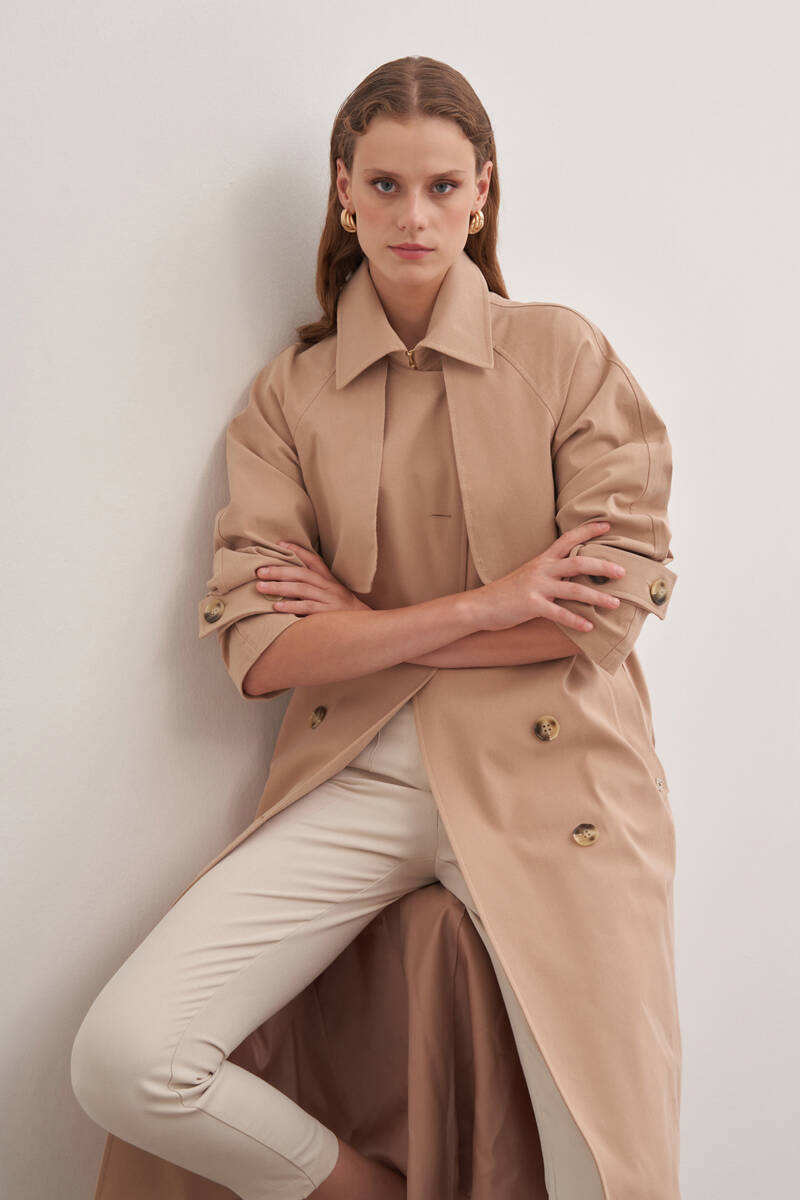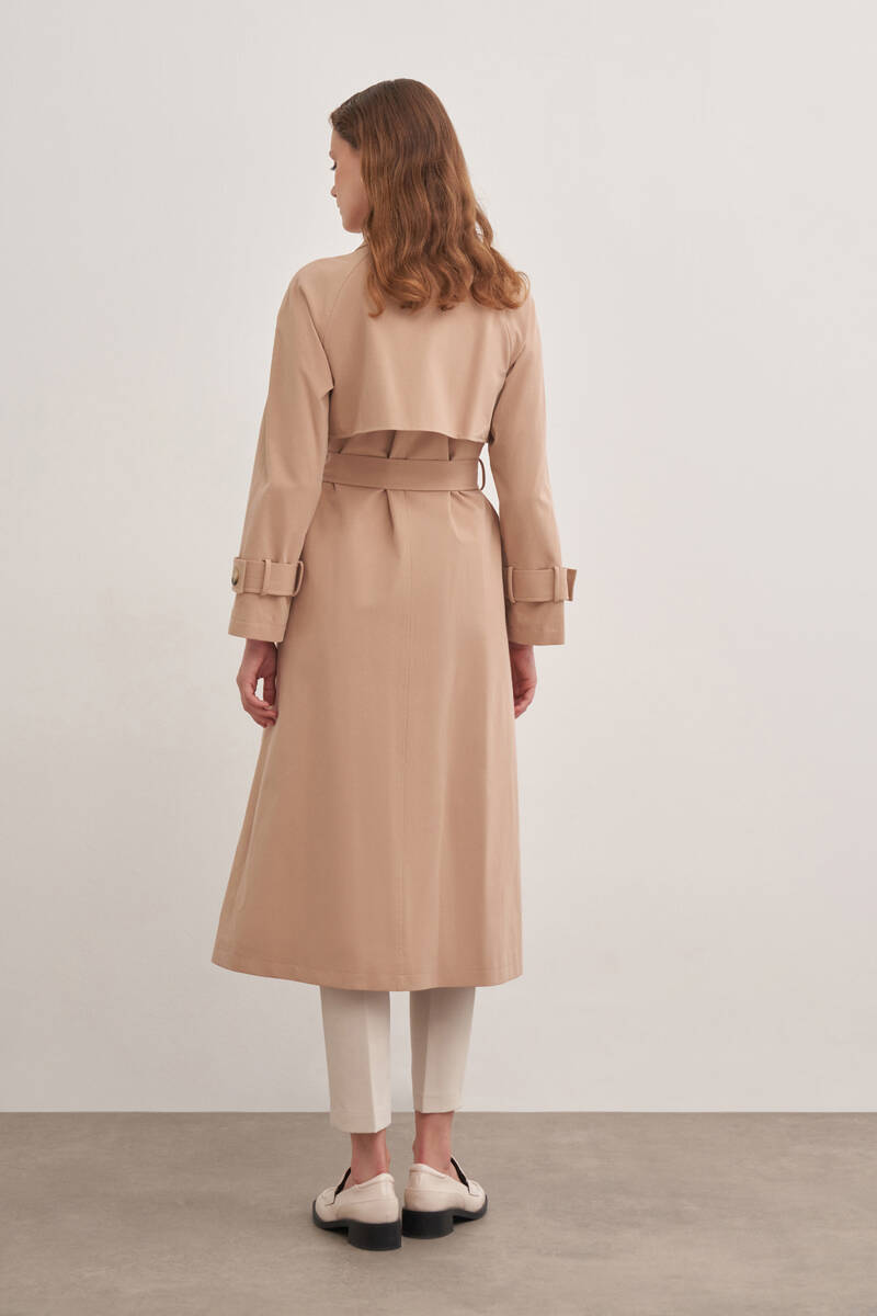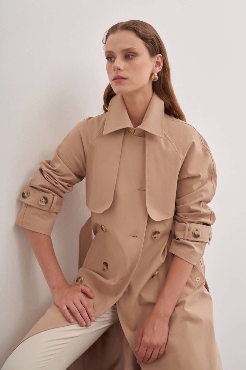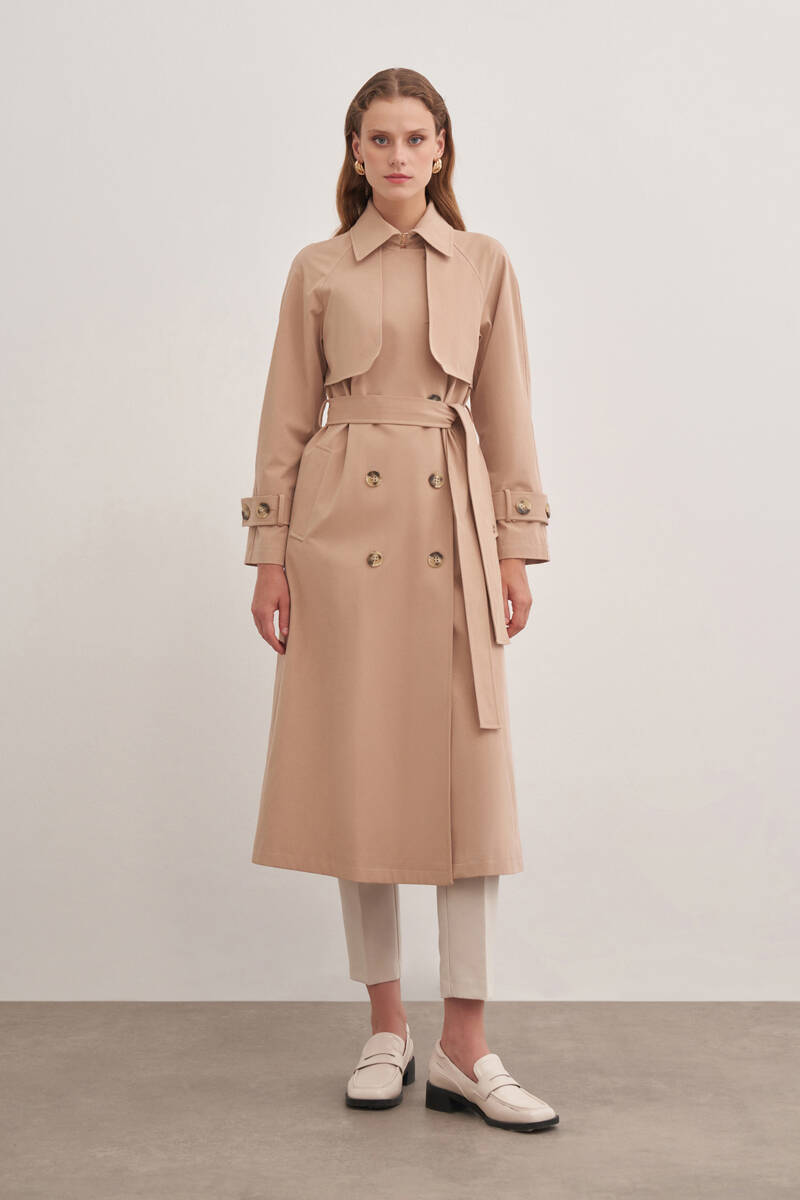 Bej İşleme Detaylı Kruvaze Kapama Trençkot