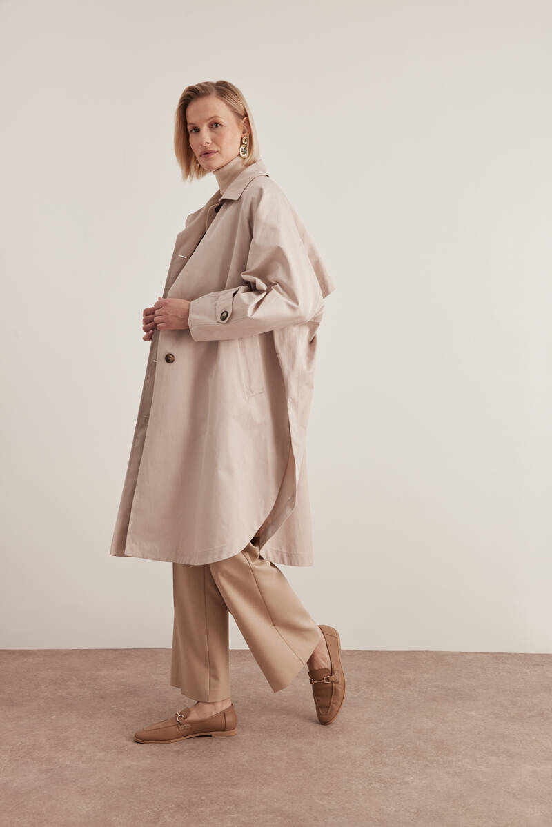 Bej İşleme Detaylı Kruvaze Kapama Trençkot
