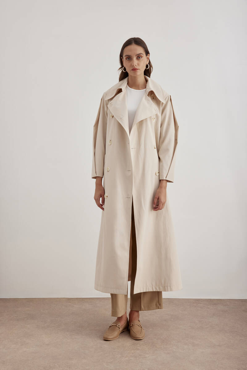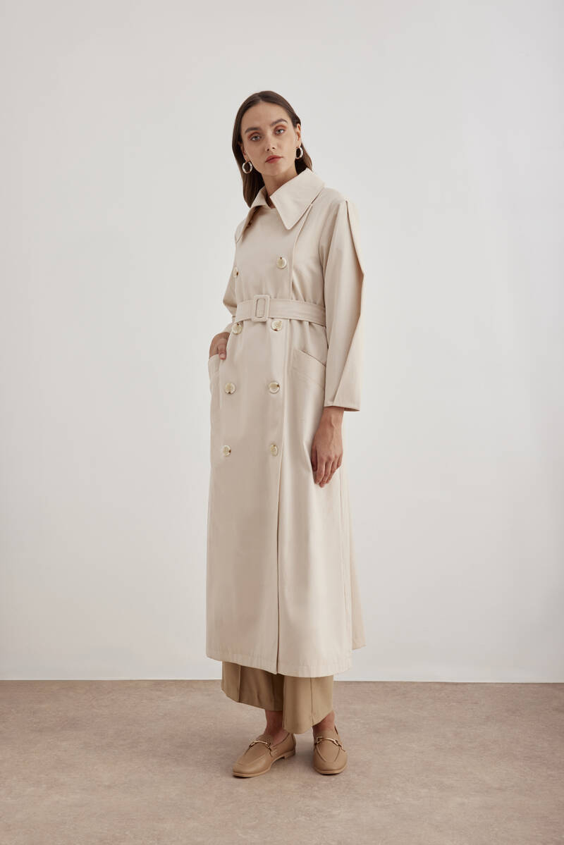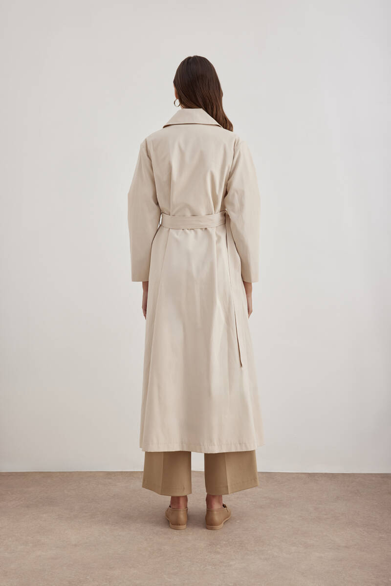 Bej Yanları Yırtmaçlı Keten Pardösü