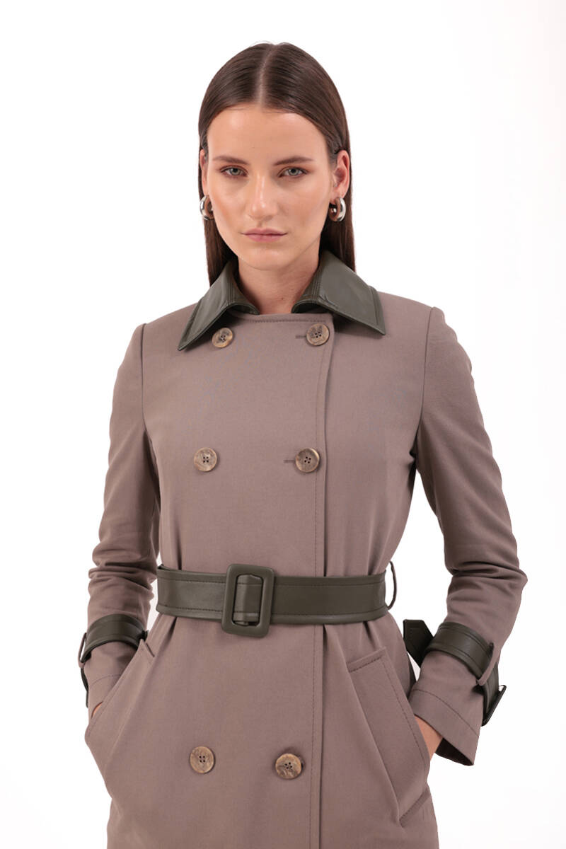 Taş Deri Detaylı Kruvaze Trençkot