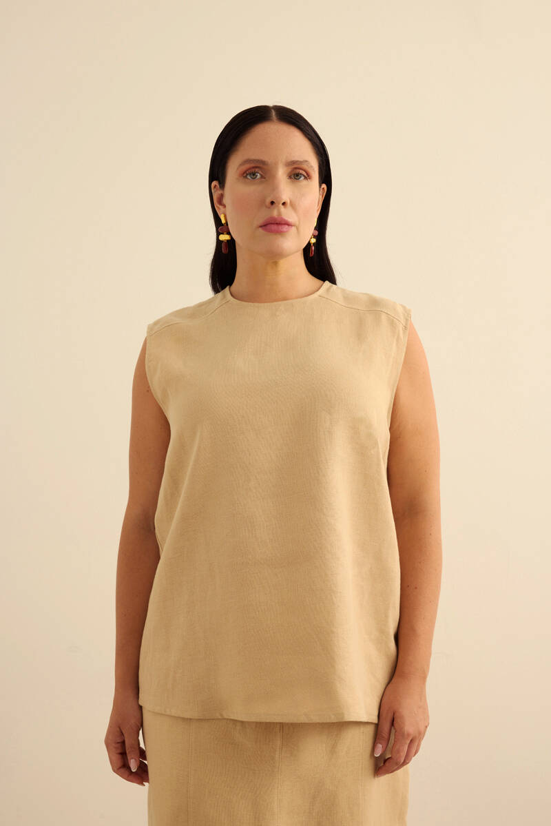 Taş Bisiklet Yaka Kolsuz Keten Bluz