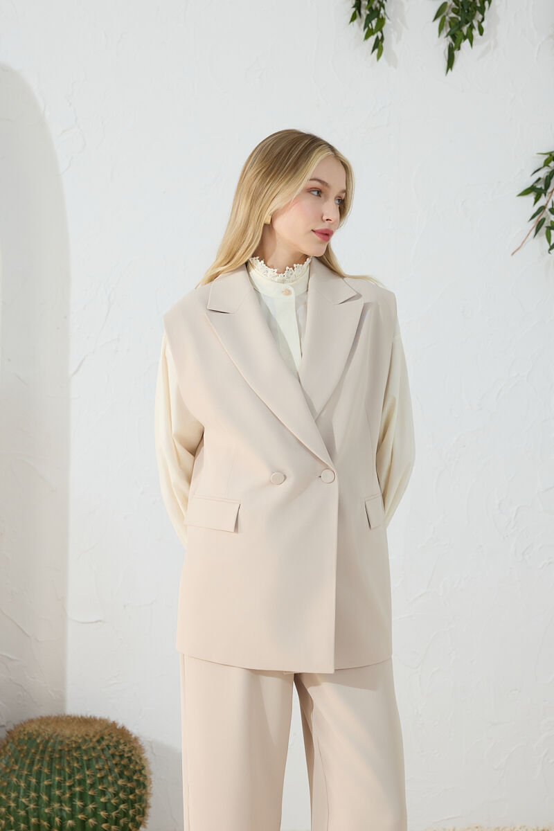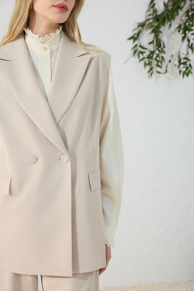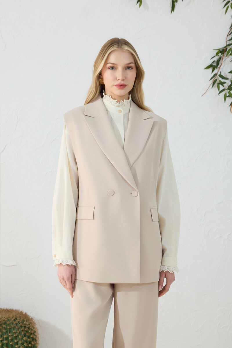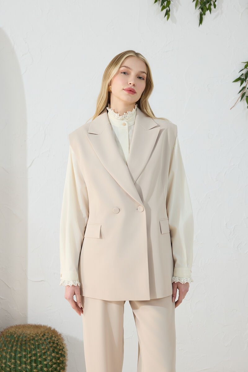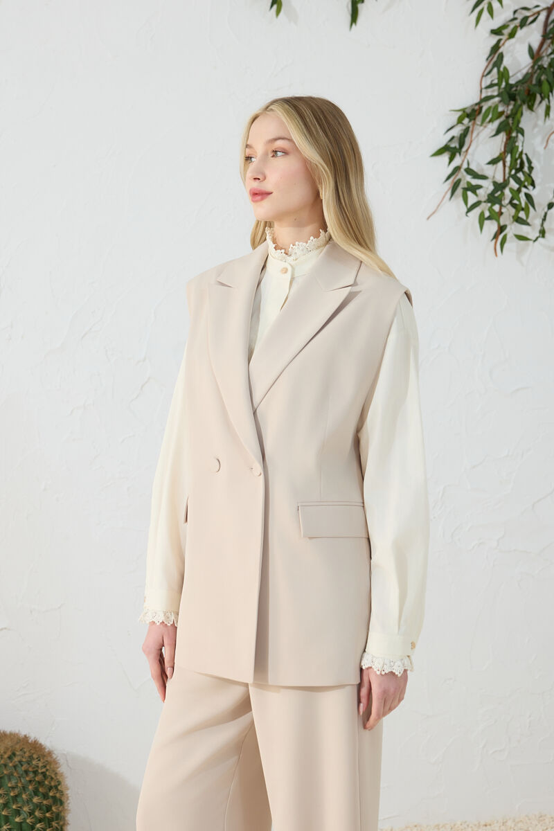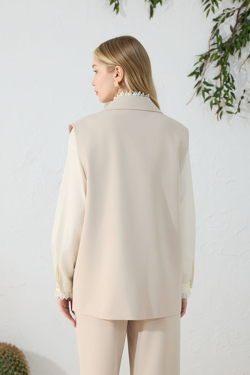 Ekru Fonksiyonel Dantel Detaylı Bluz