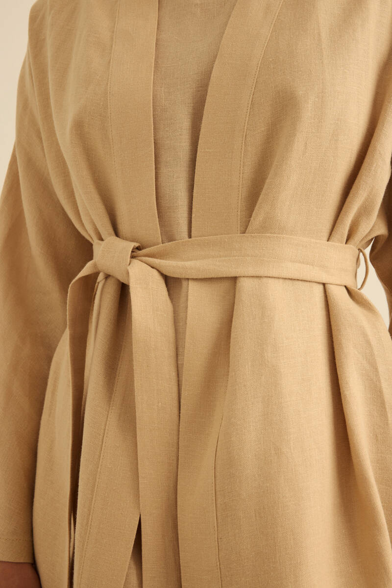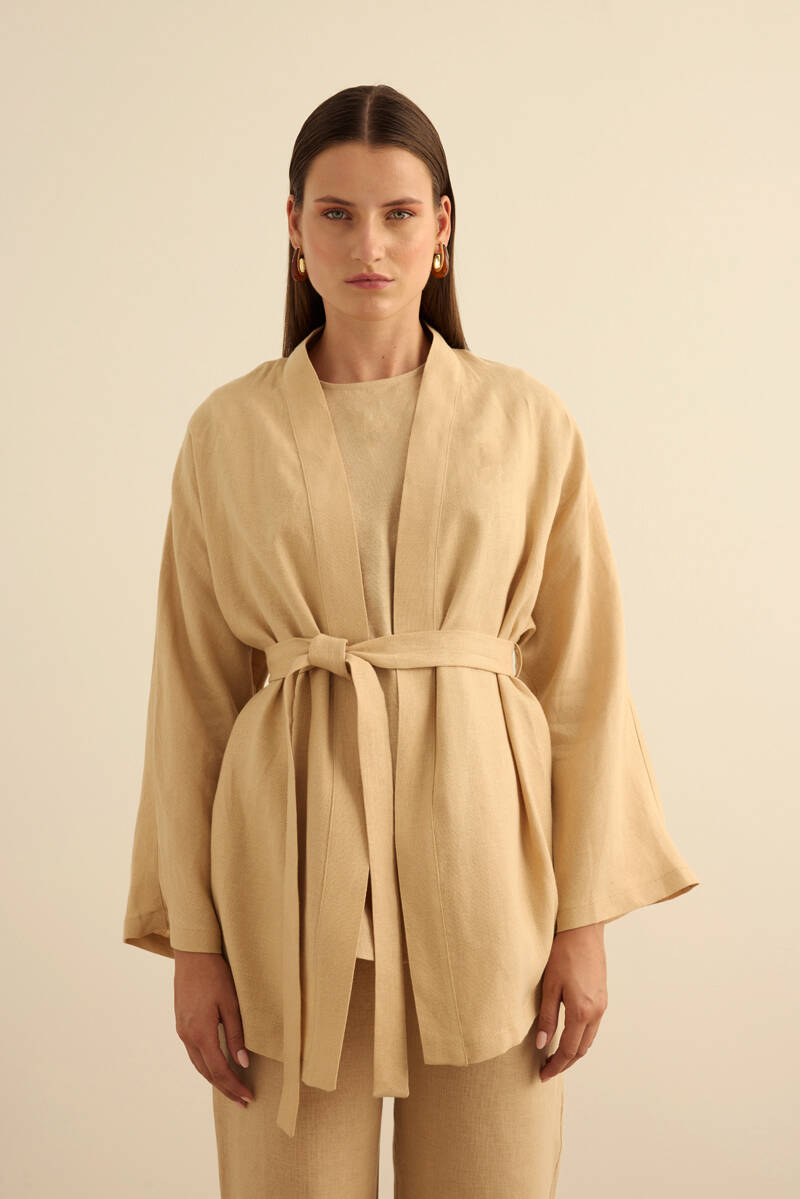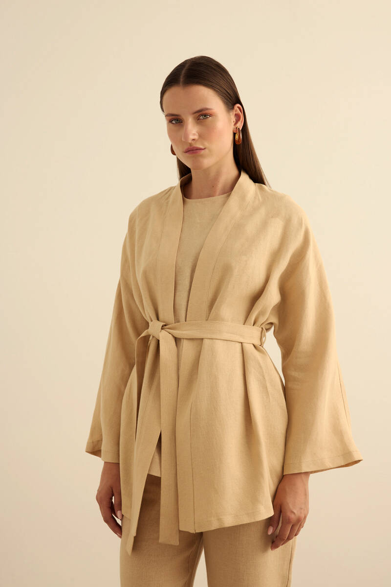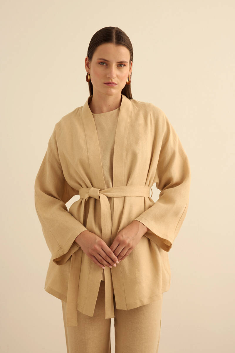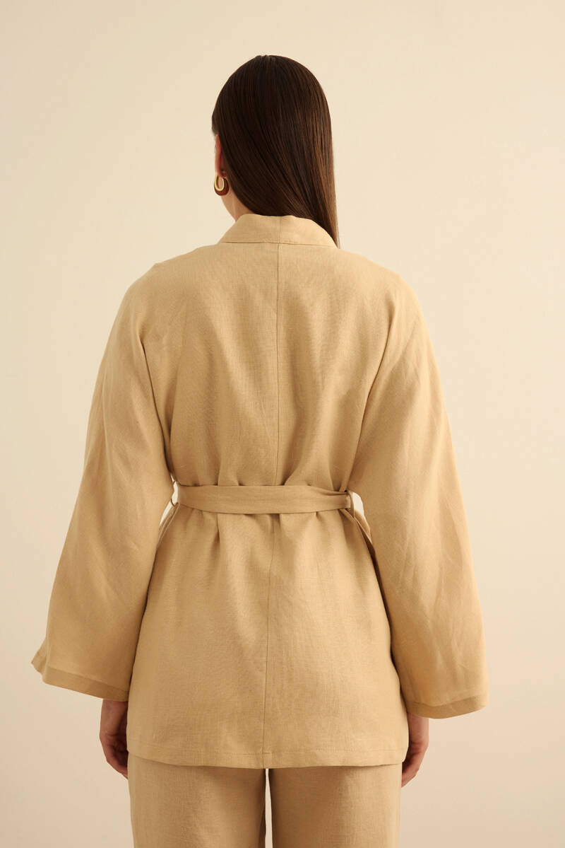 Ekru Yaprak Desenli Keten Yandan Bağlamalı Kimono
