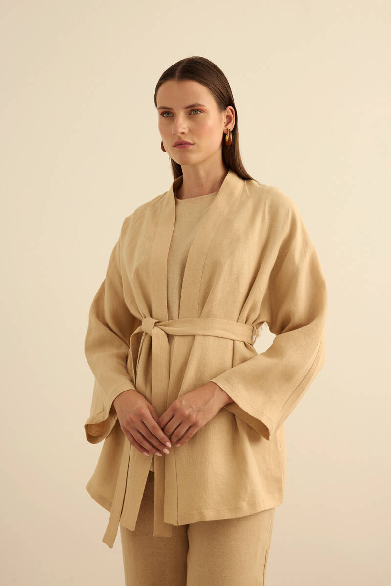 Yeşil Seyyar Kuşaklı Keten Kımono