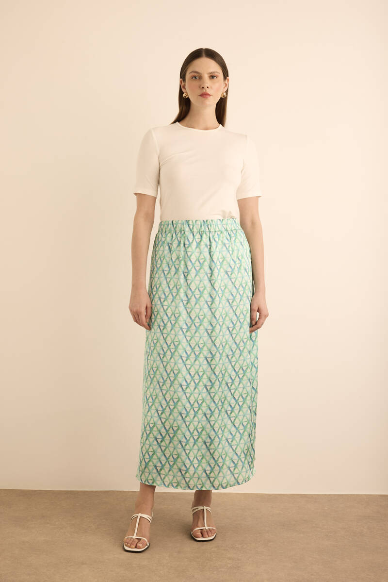 Turkuaz Geometrik Desenli Beli Lastikli Etek