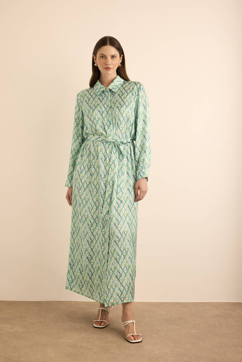 Turkuaz Geometrik Desenli Gömlek Elbise