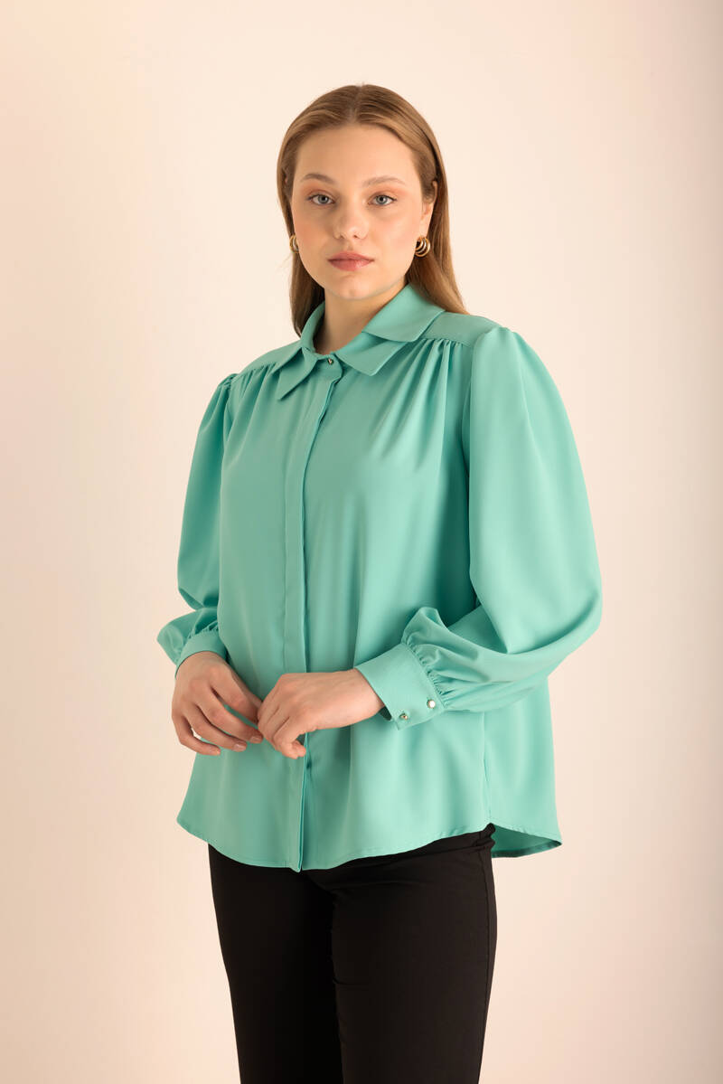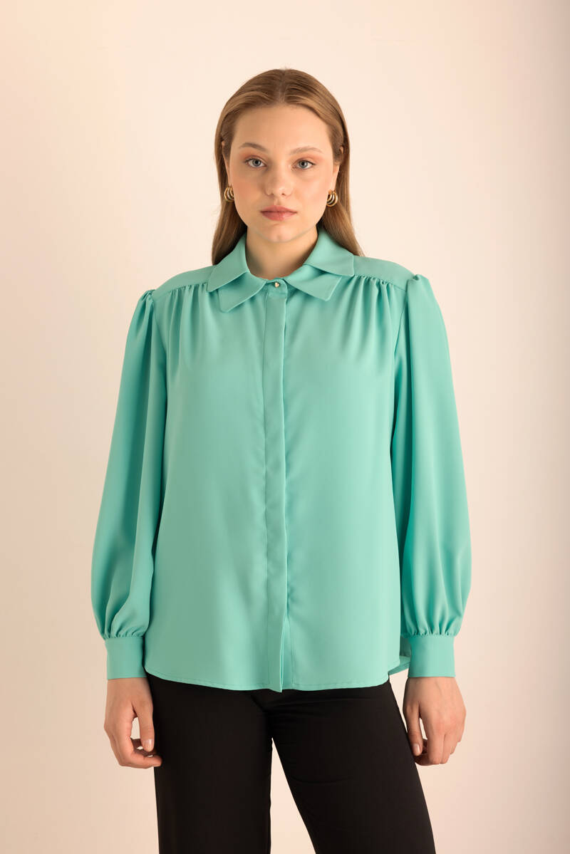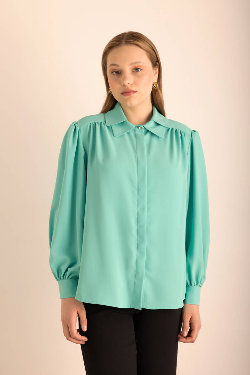 Pembe Yakası Pili ve İşleme Detaylı Dokuma Bluz