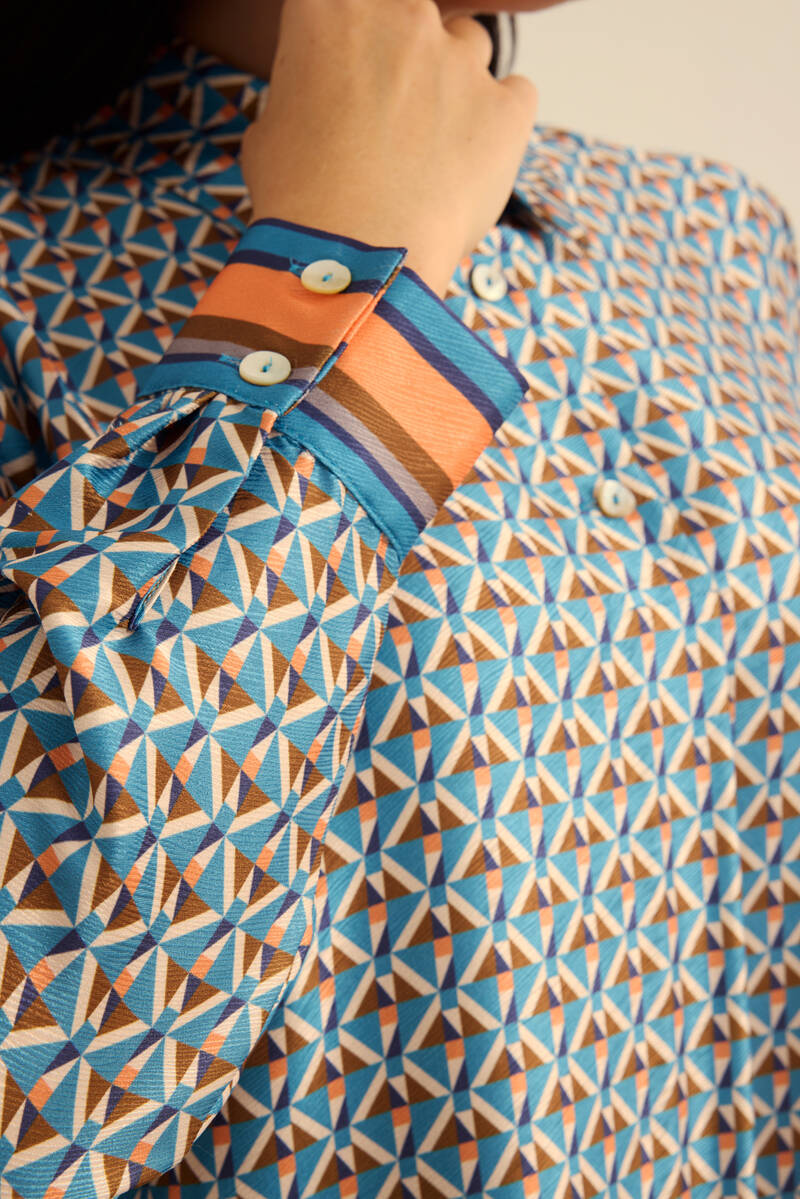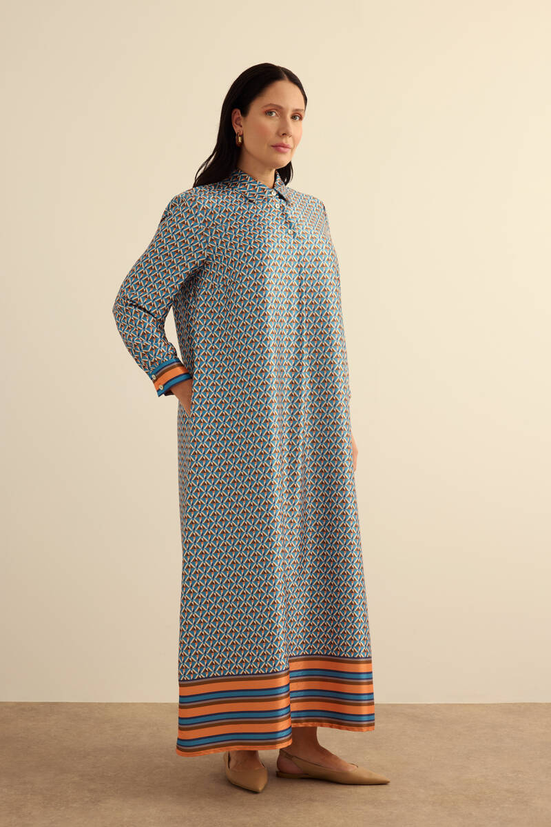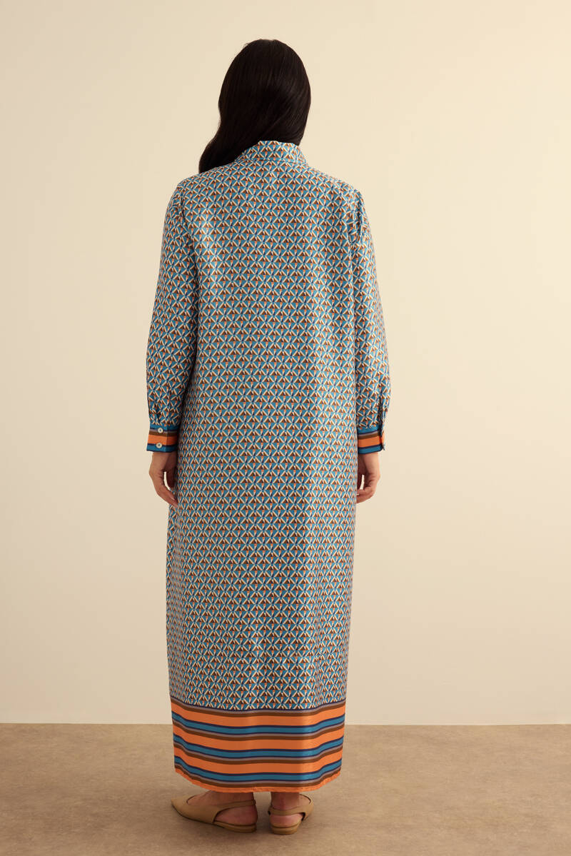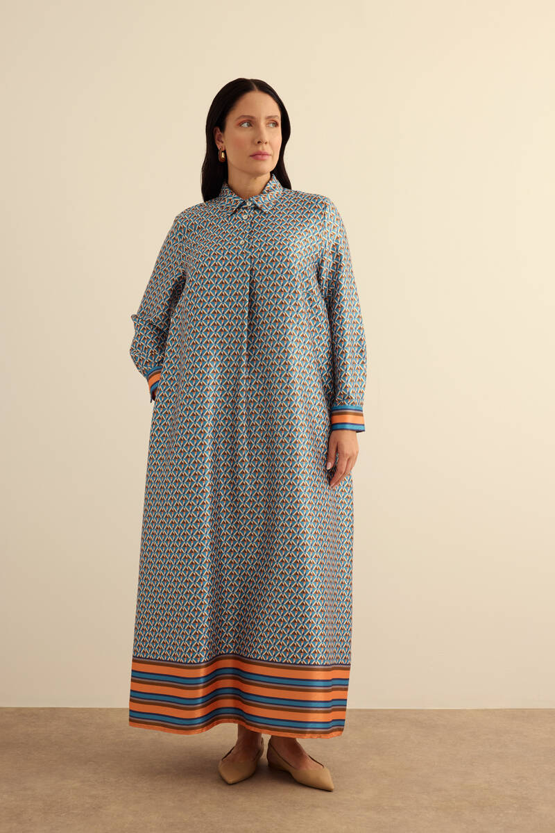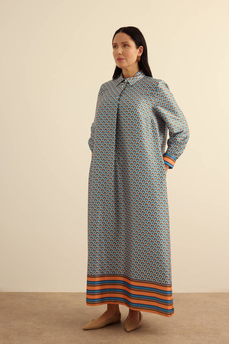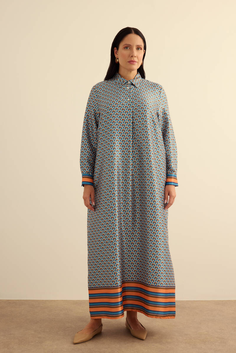 Turkuaz Geometrik Desenli Gömlek Elbise