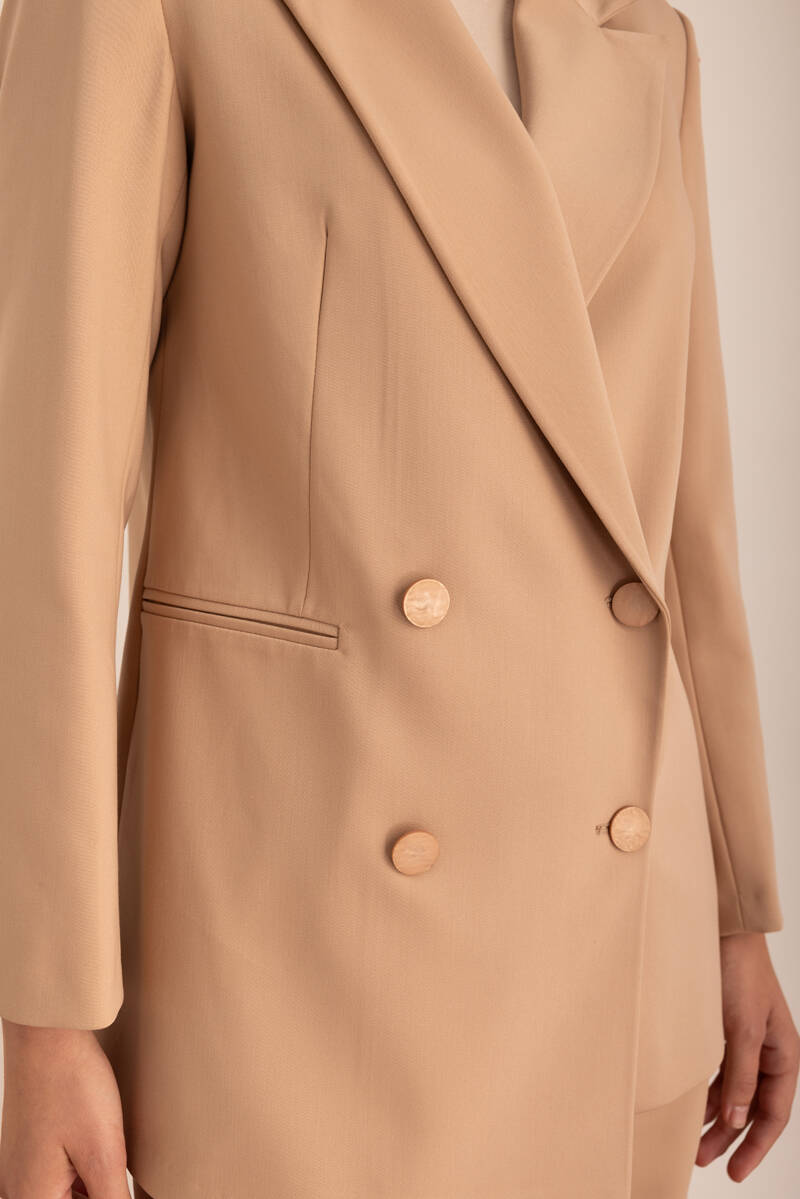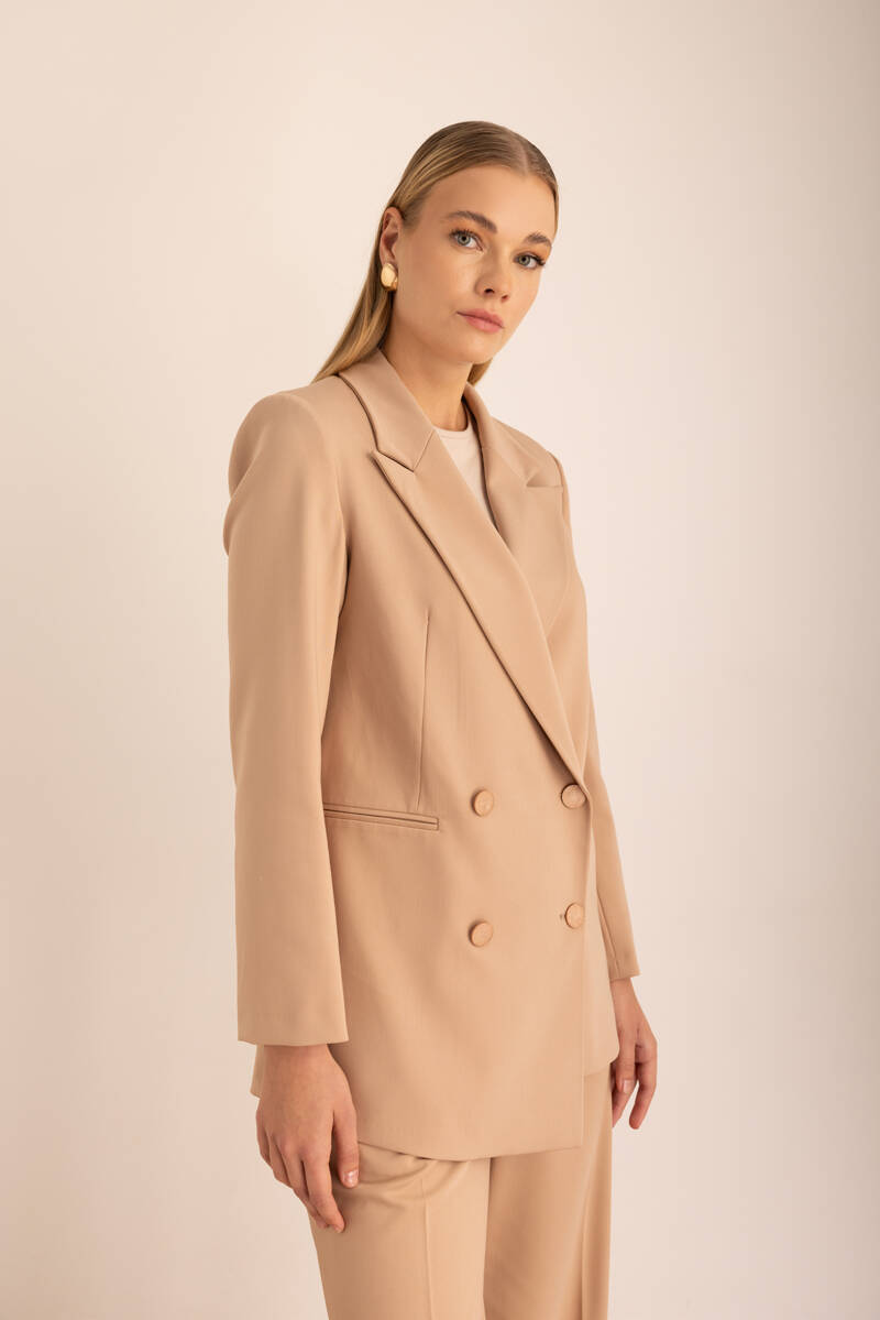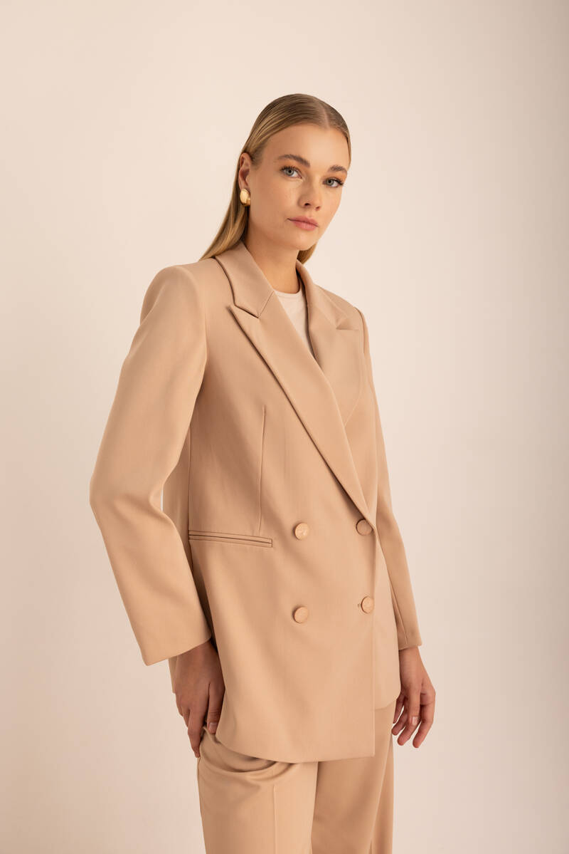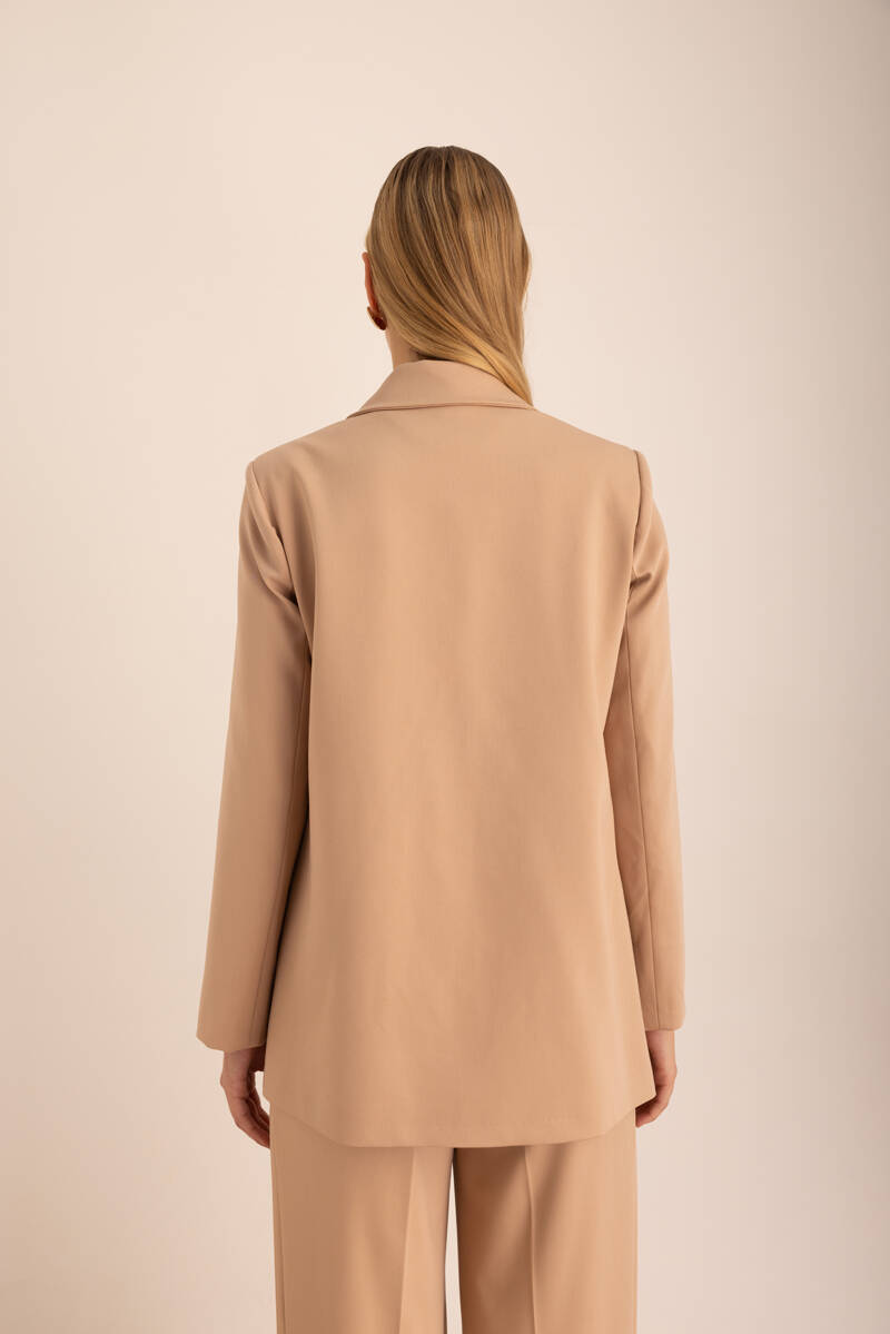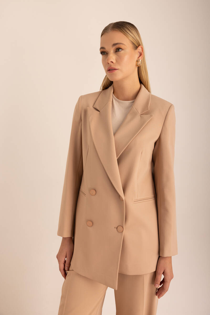 Ekru Sıfır Yaka Metal Düğmeli Şık Ceket
