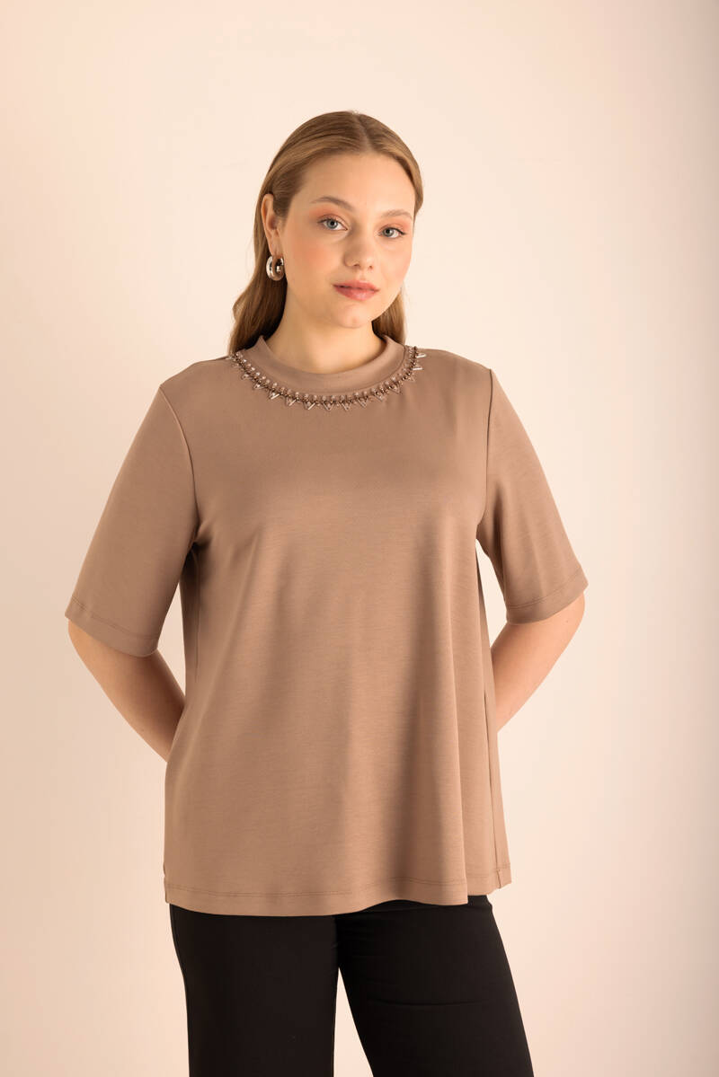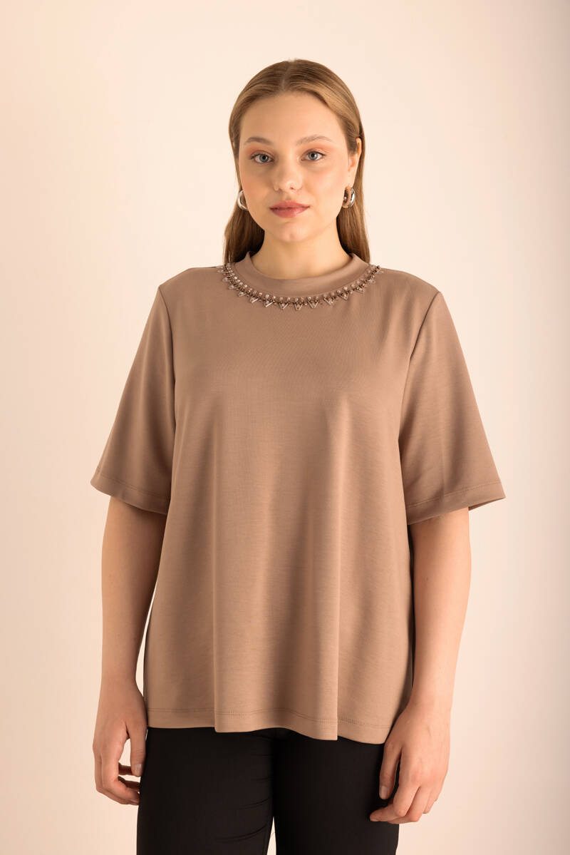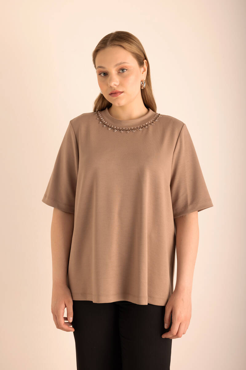 Vizon Yakası İşlemeli Örme Kısa Kollu Bluz