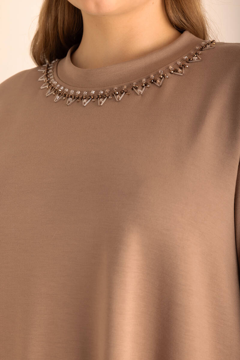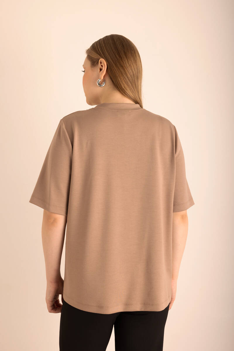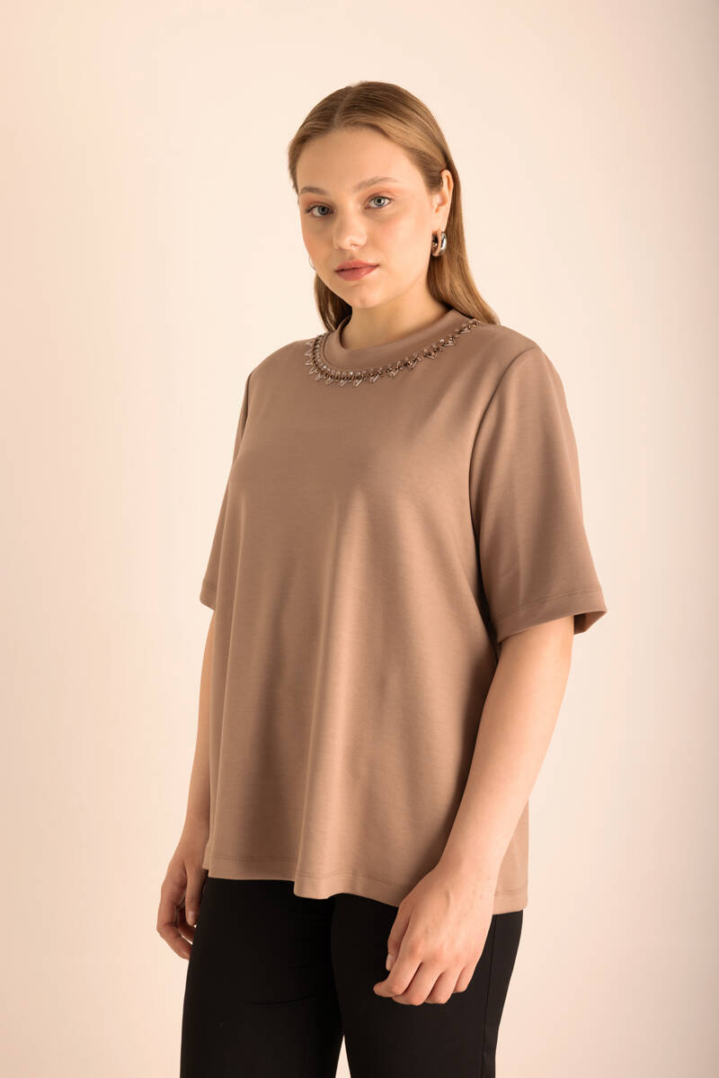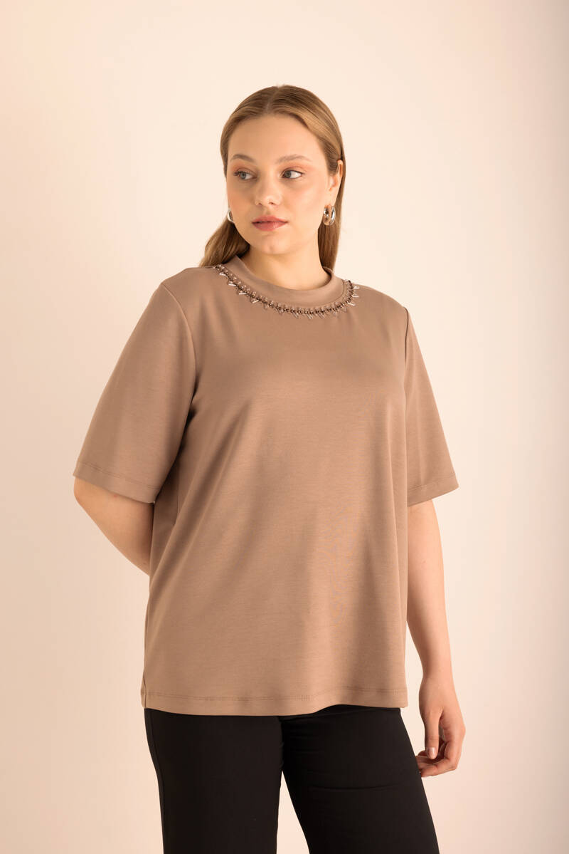 Vizon Yakası İşlemeli Örme Kısa Kollu Bluz
