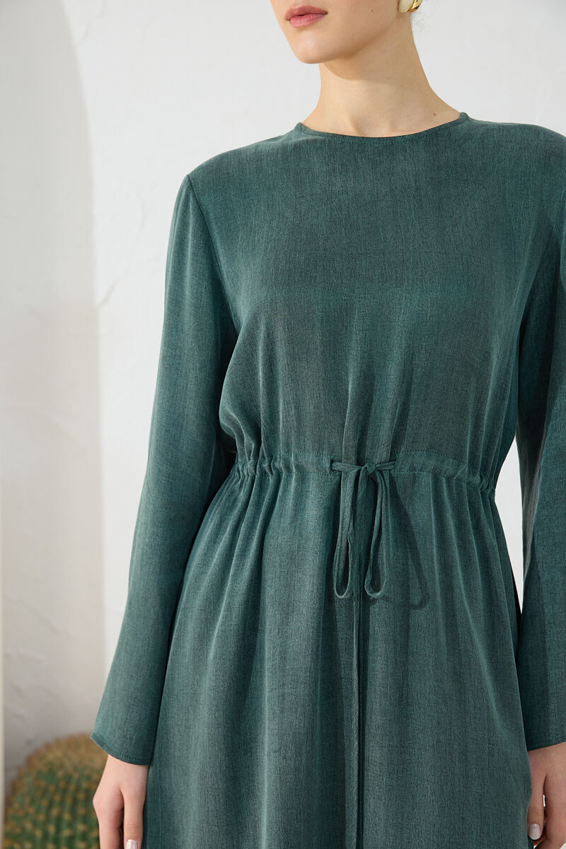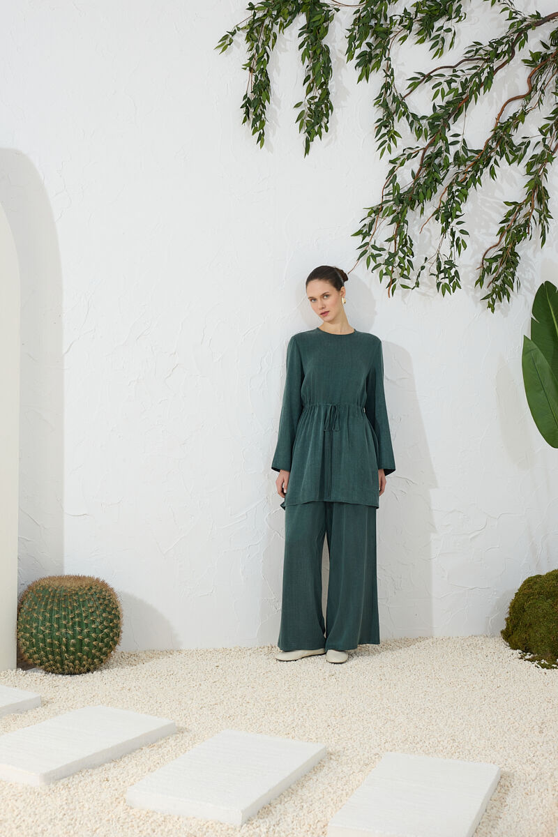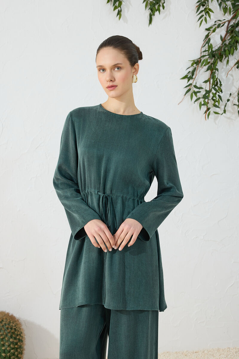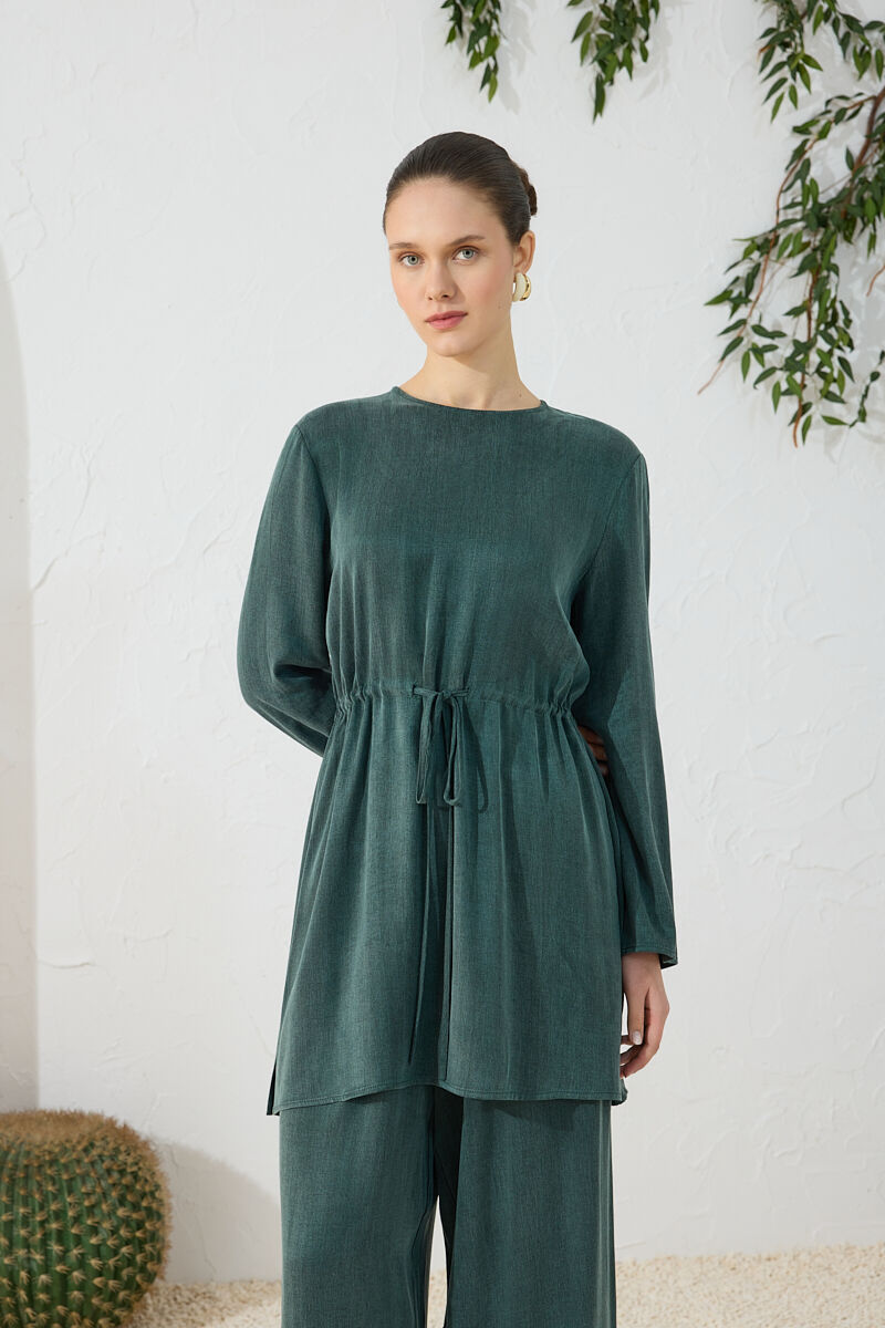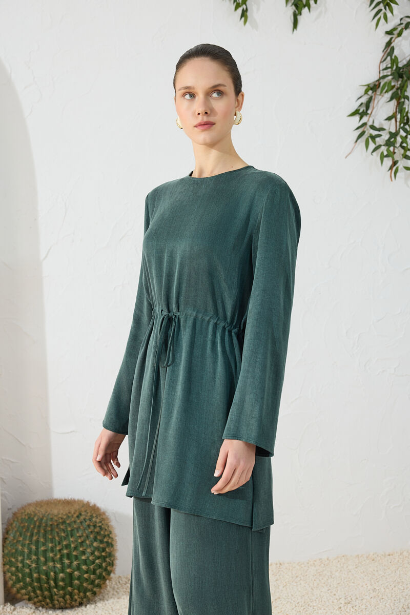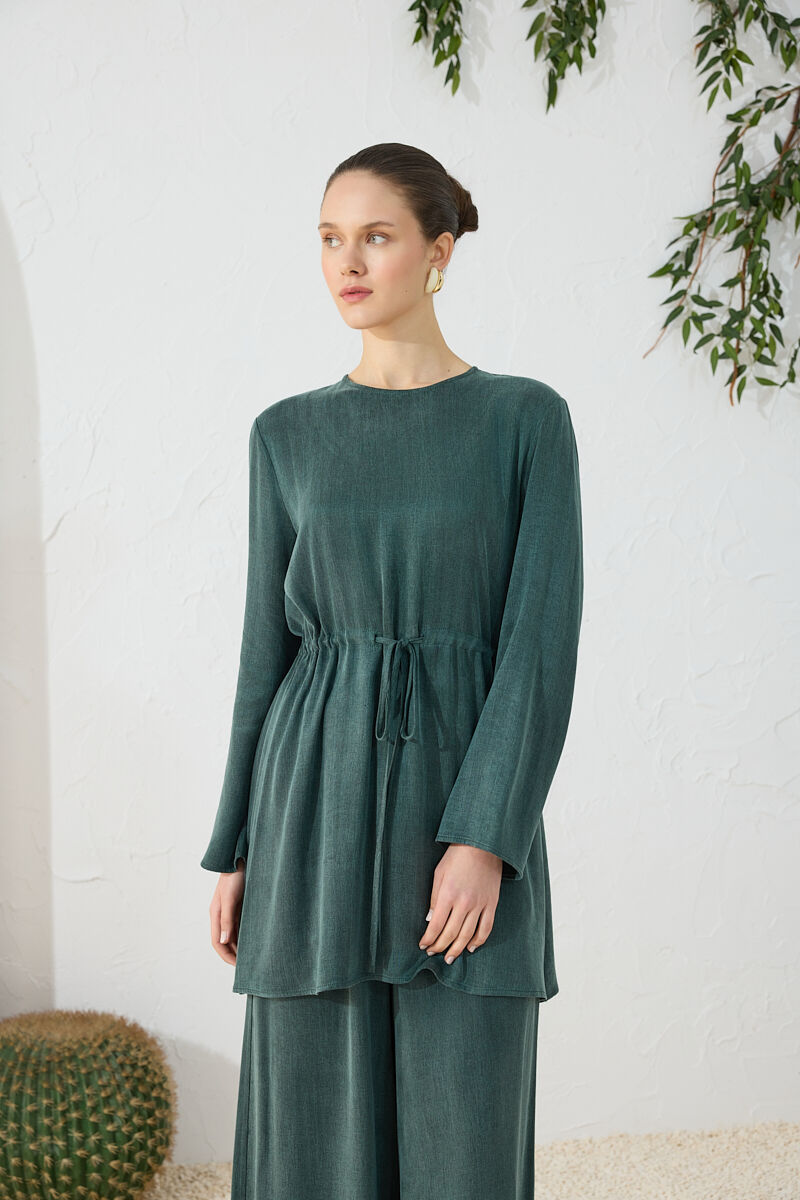 Yeşil Beli Ayarlanabilir Lastik Detaylı Tunik