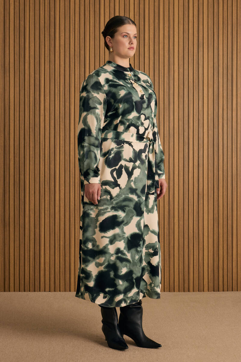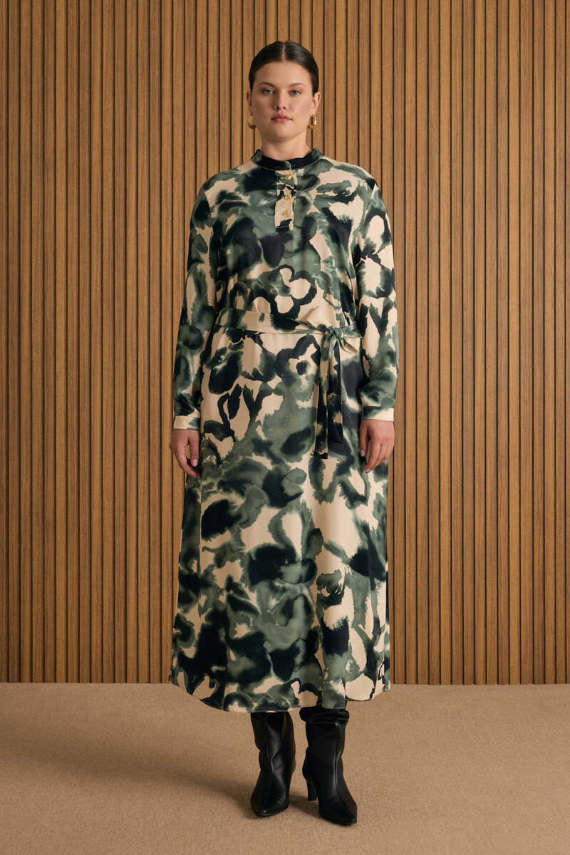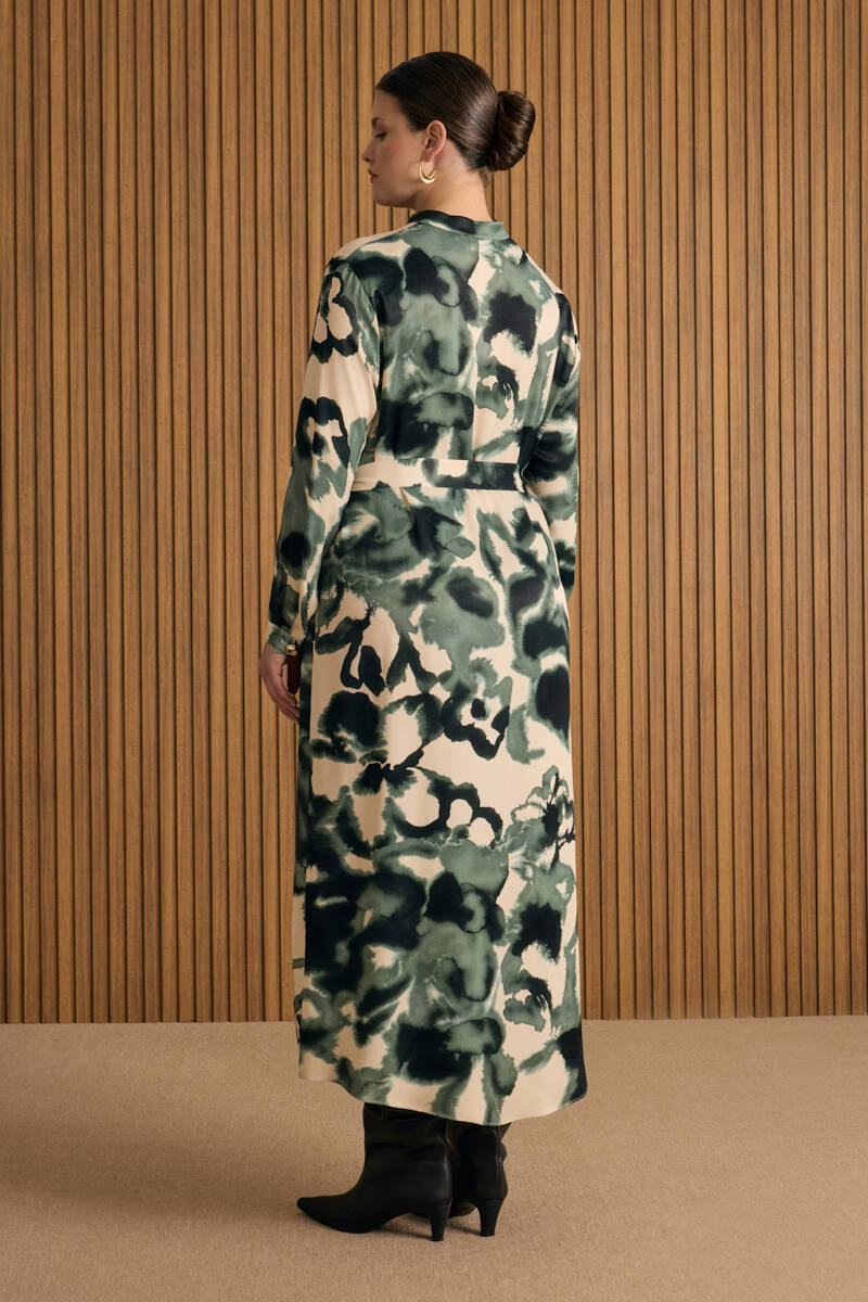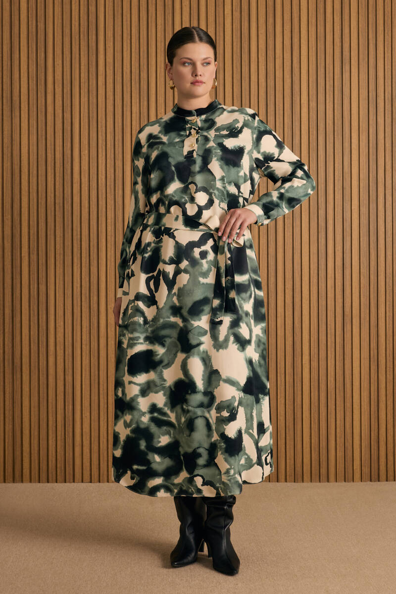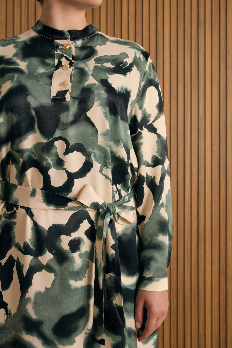 Ekru Desenli Gömlek Elbise