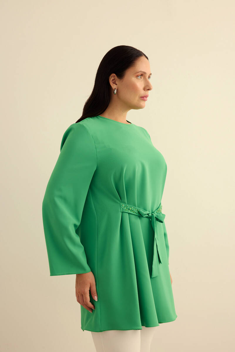 Ekru Belden Tek Tarafı Bağcık ve Büzgü Detaylı Tunik