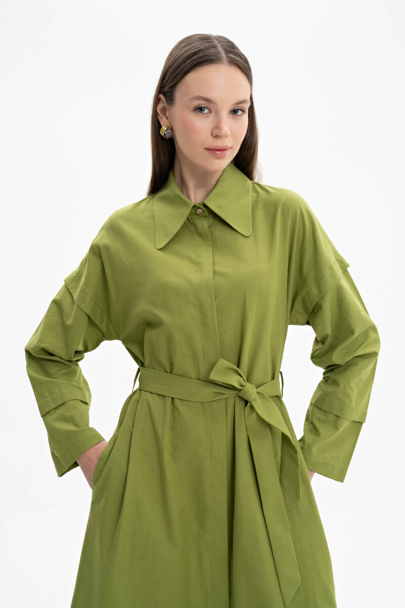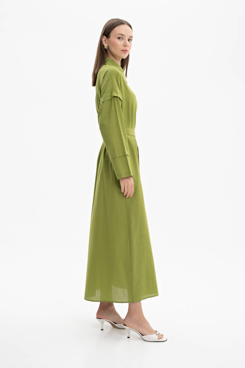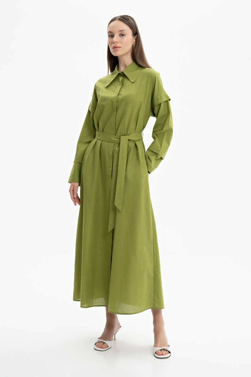 Ekru Belden Kuşaklı Pileli Elbise