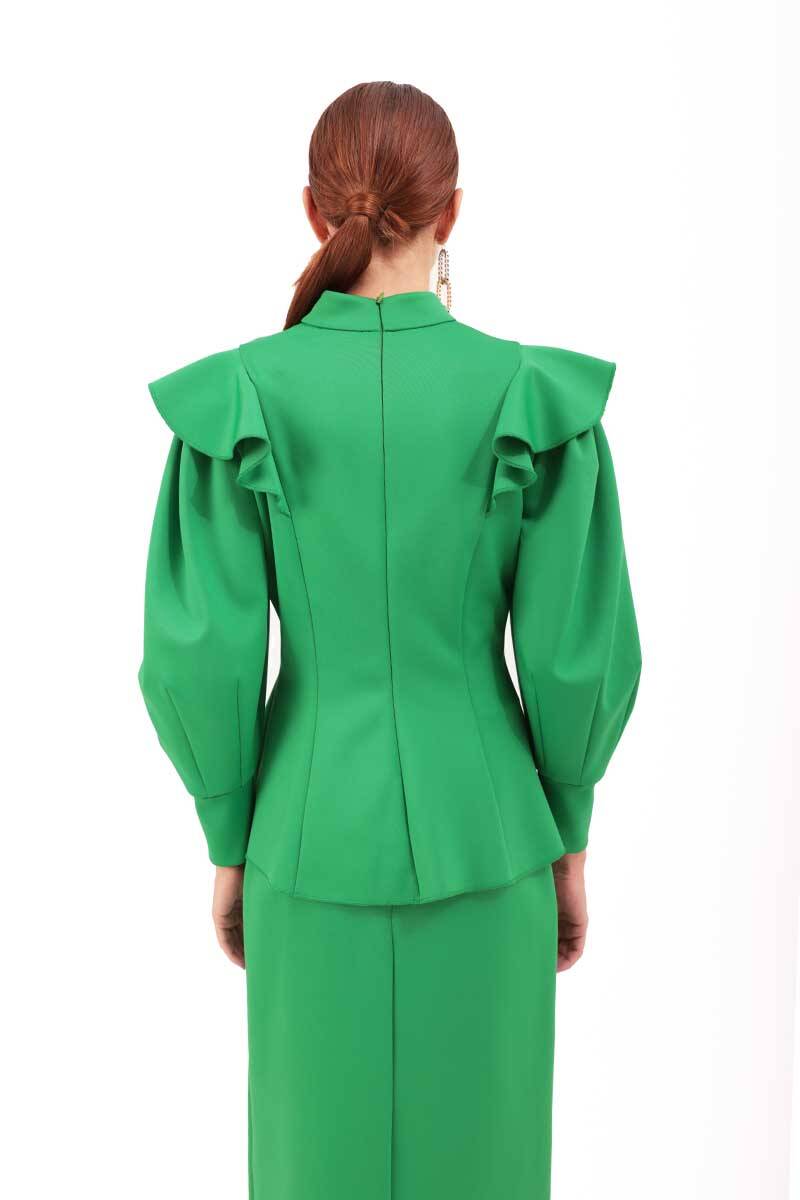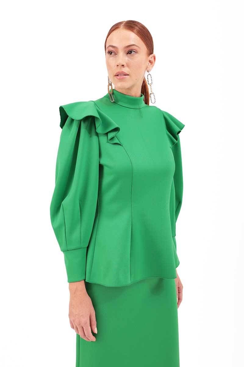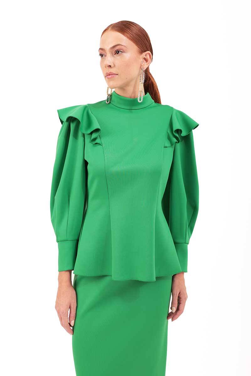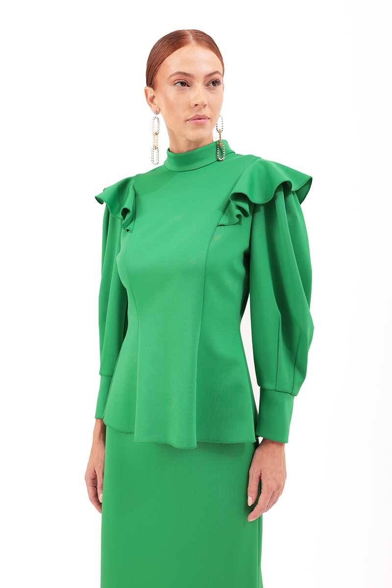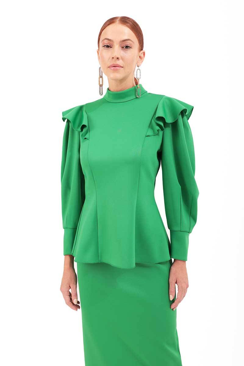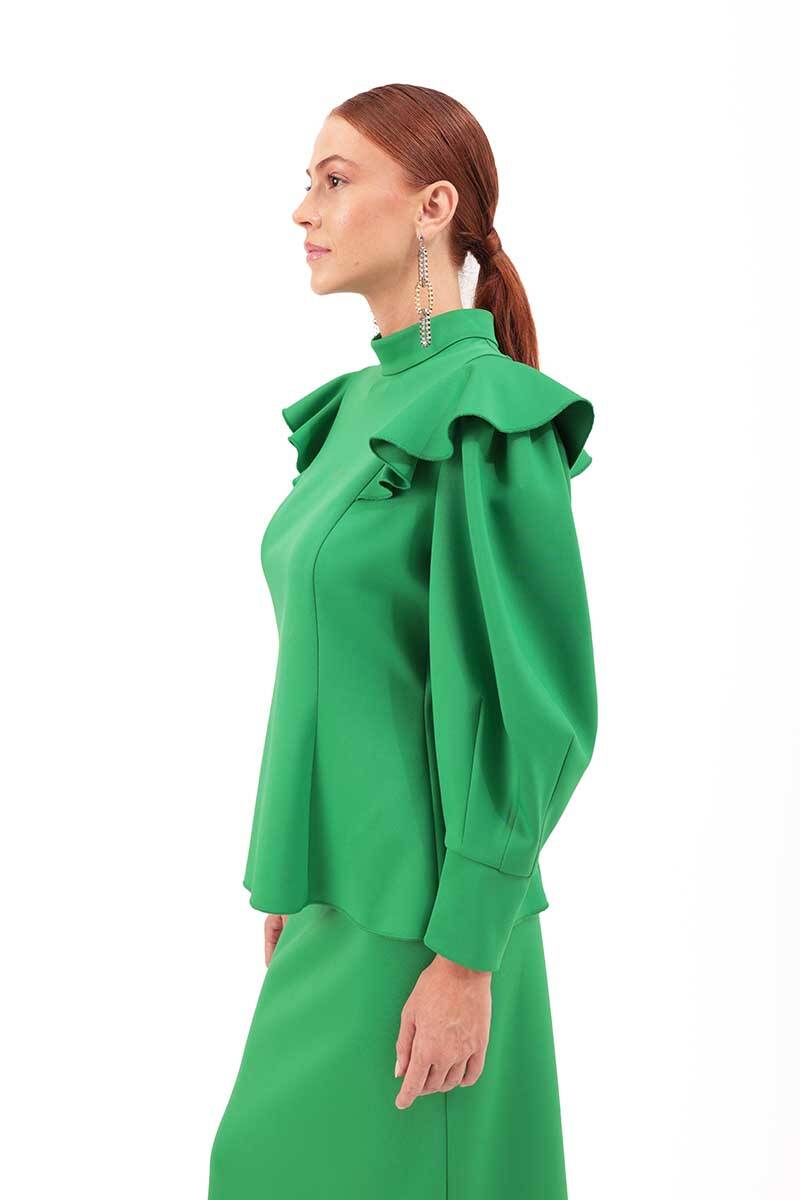 Yeşil Kolları Volanlı Örme Bluz