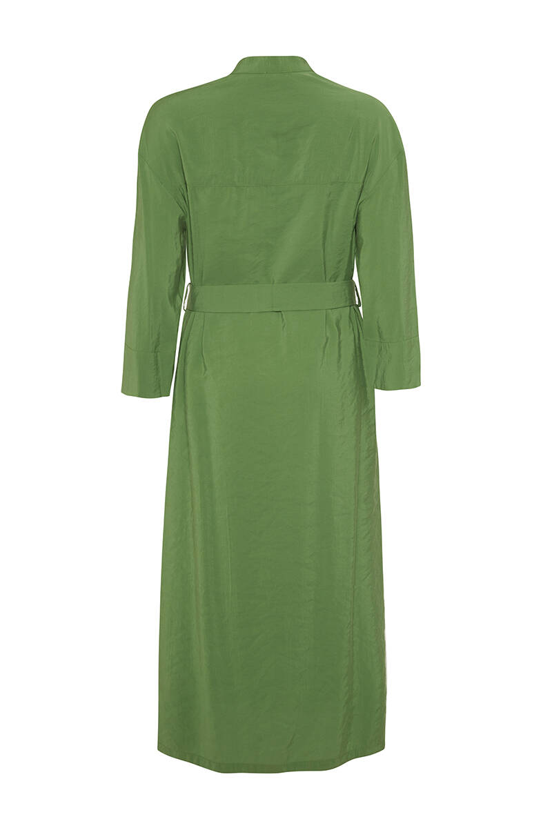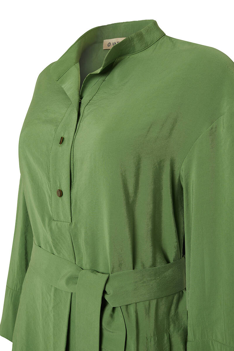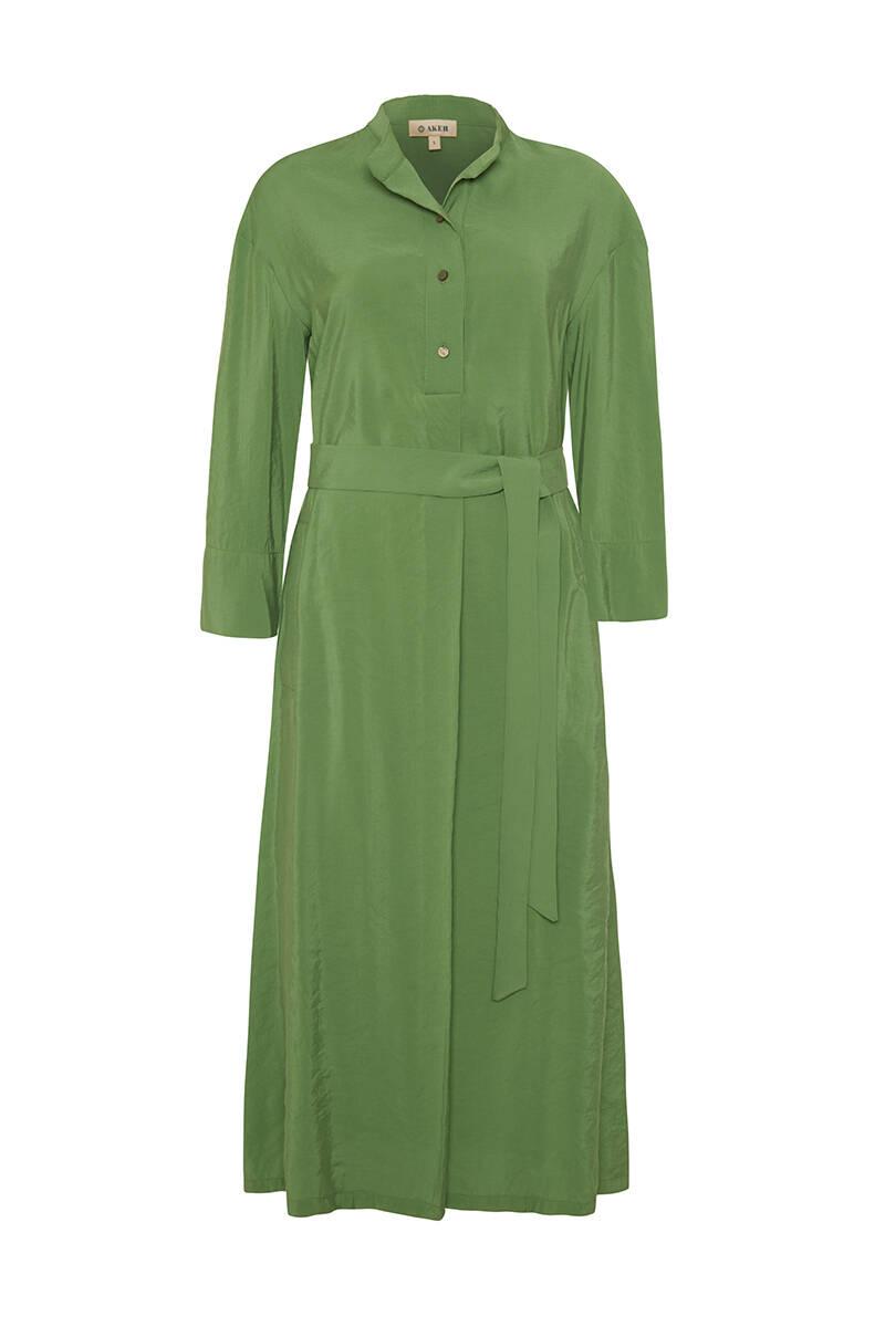 Yeşil Yarım Pat Detaylı Belden Kuşaklı Elbise
