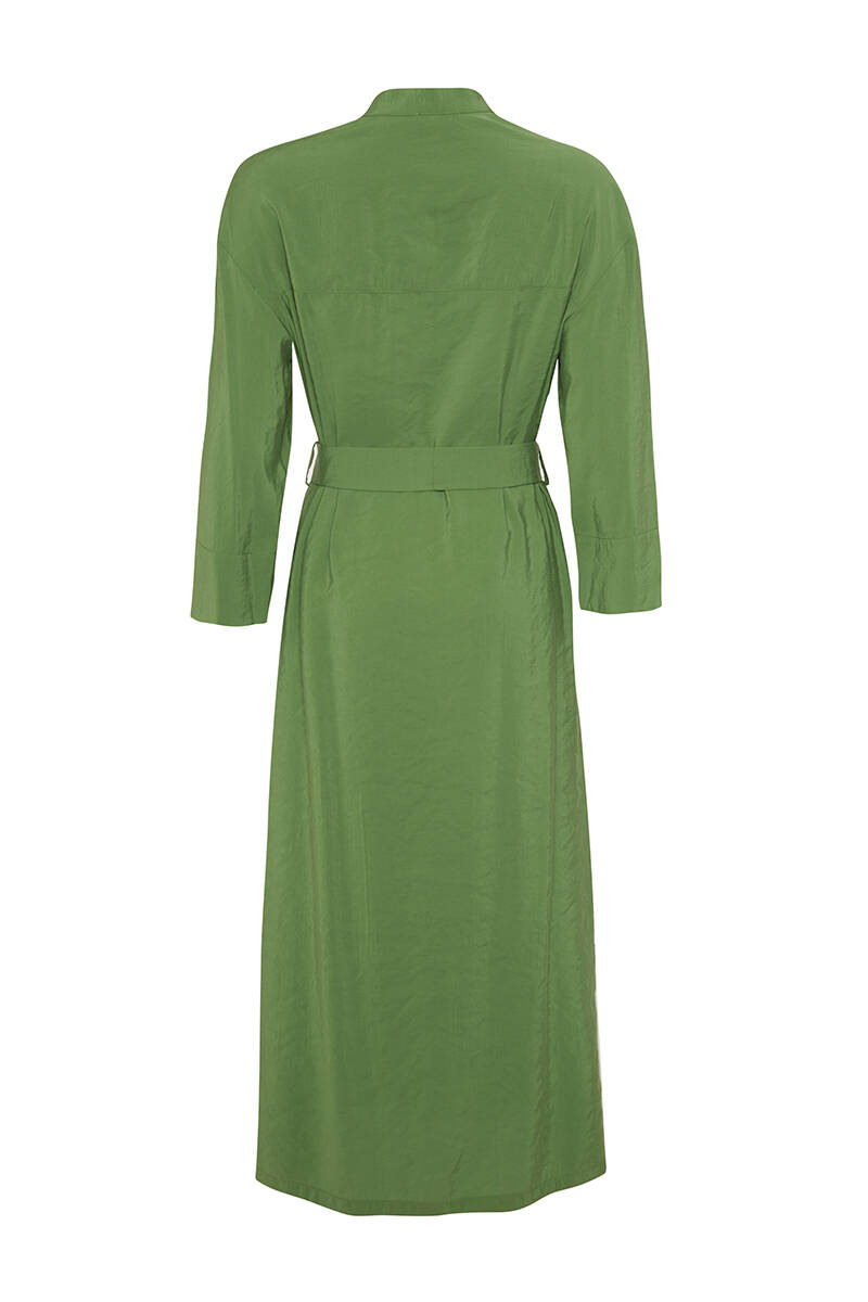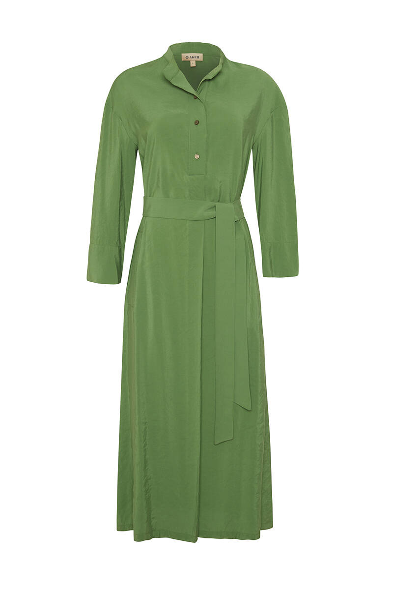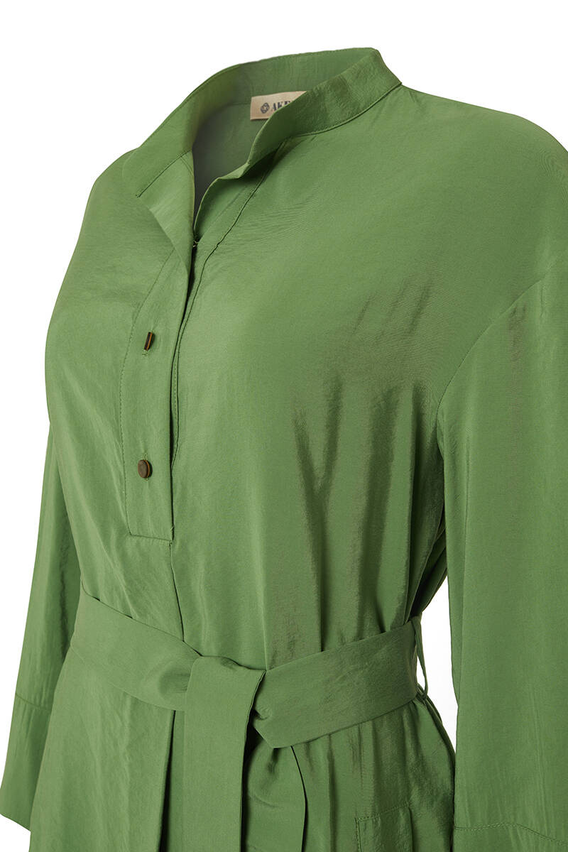 Yeşil Yarım Pat Detaylı Belden Kuşaklı Elbise